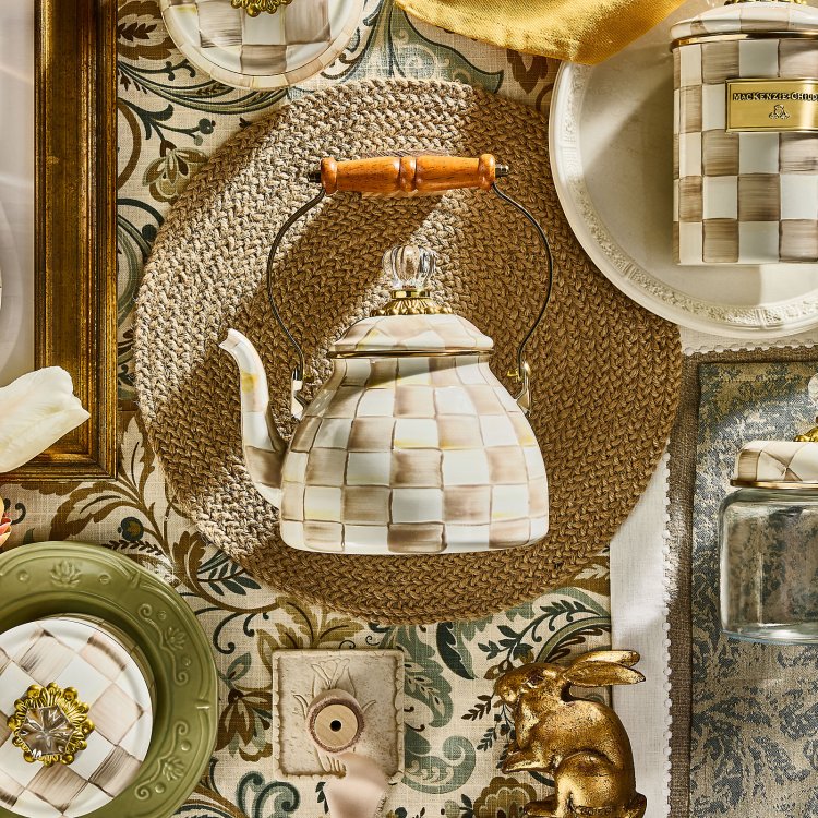 Bubbling over with MacKenzie-Childs style, our Mocha Check Enamel 2 Quart Tea Kettle will have you finding new reasons to put the kettle on. The heavy-gauge steel underbody is glazed with hand-painted, coffee-colored checks and topped with an elegant clear glass knob.