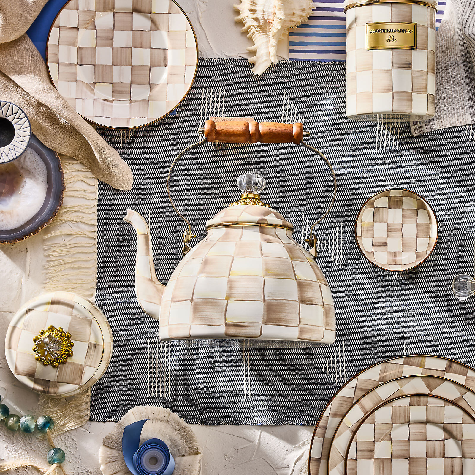 Bubbling over with MacKenzie-Childs style, our Mocha Check Enamel 3 Quart Tea Kettle will have you finding new reasons to put the kettle on. The heavy-gauge steel underbody is glazed with hand-painted, coffee-colored checks and topped with an elegant clear glass knob.