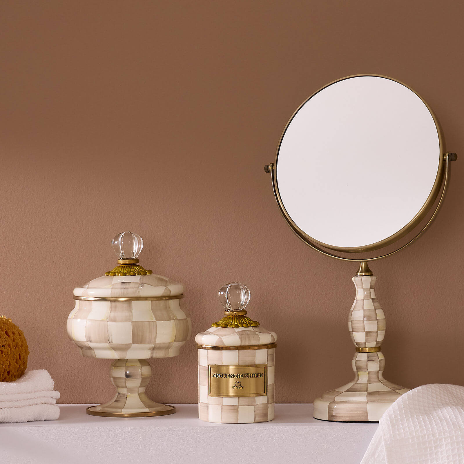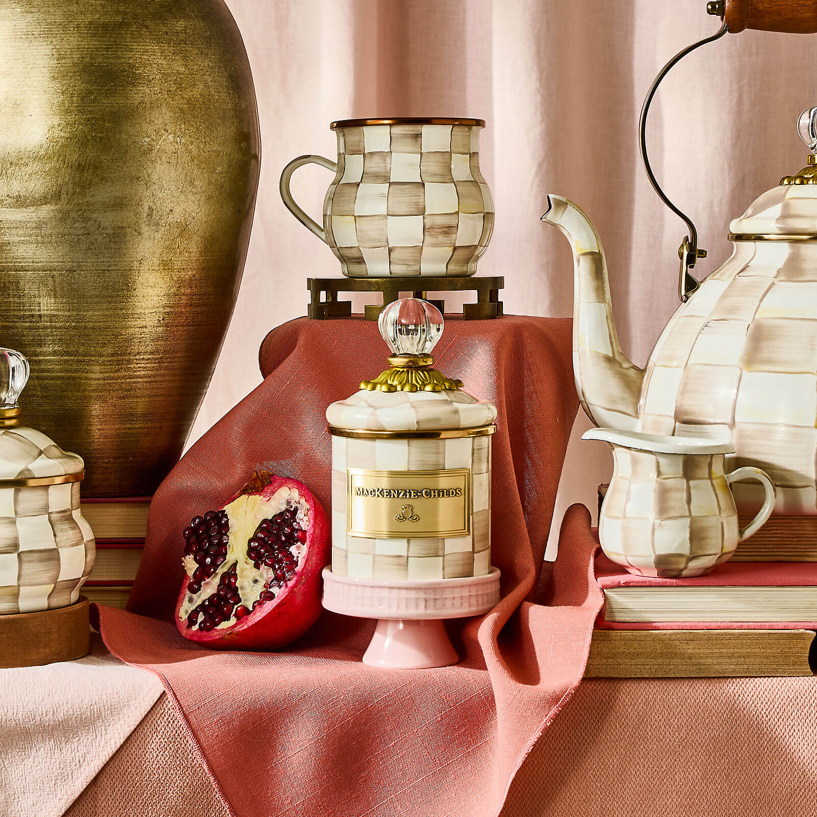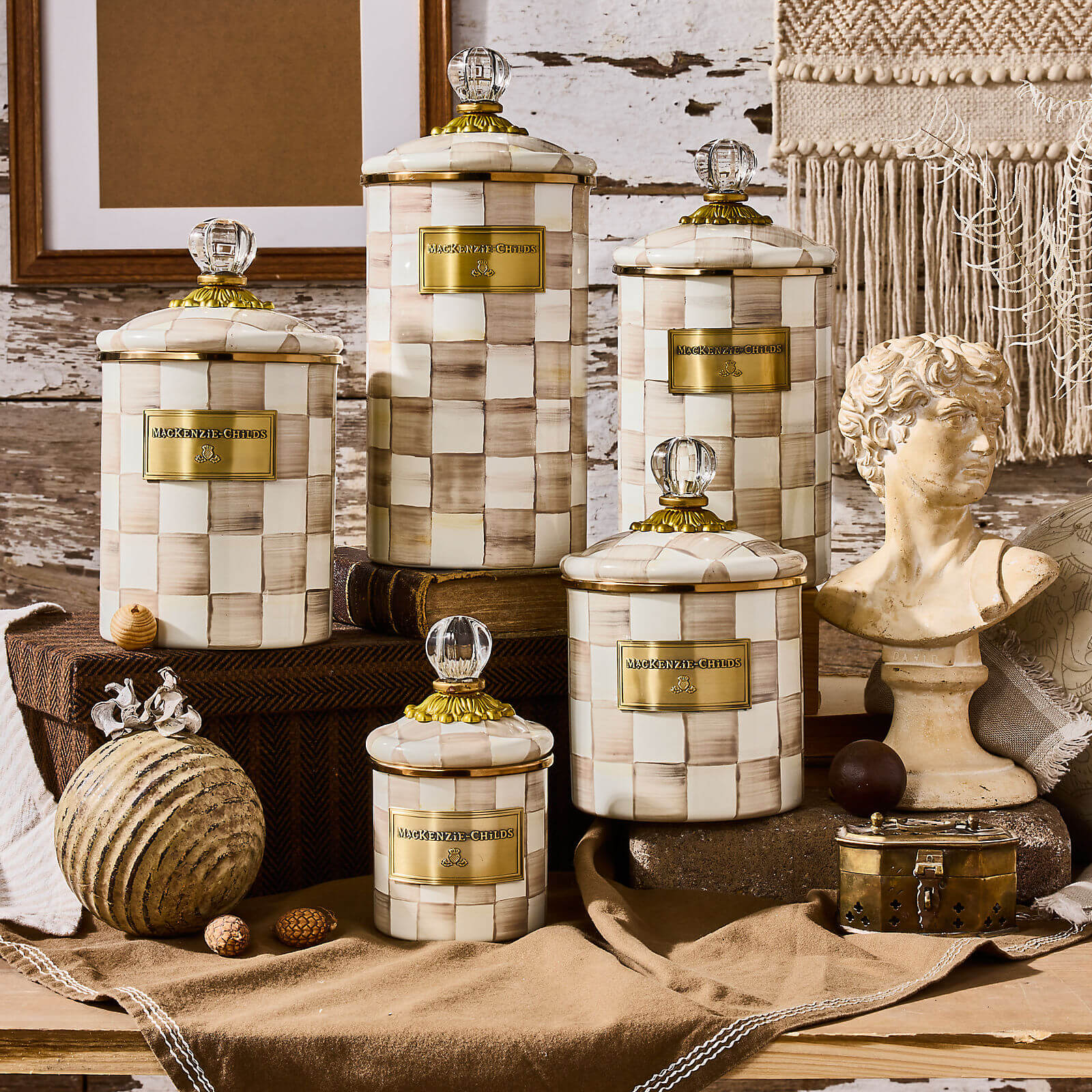 Add to the endless possibilities for our canisters with the Mocha Check Mini Canister. Our smallest sized canister, the Mini stands handsomely alone or harmonizes delightfully in a set. Keep it in the kitchen or invent new uses around the house. Each enameled steel canister is hand-painted with color-dragged, coffee-colored checks and topped with a glass knob.
