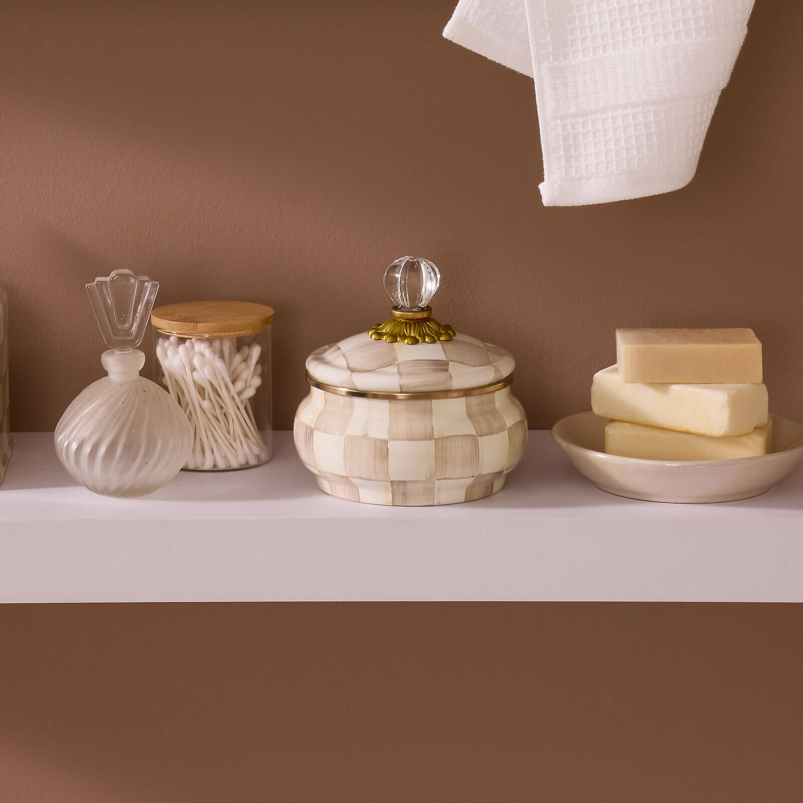 The Mocha Check Squashed Pot more than pulls its weight because this chubby silhouette holds an impressive 20 ounces. Its heavy-gauge steel underbody is color-glazed, hand-painted with color-dragged, coffee-colored checks, rimmed in bronzed stainless steel, and topped with an elegant clear glass knob.