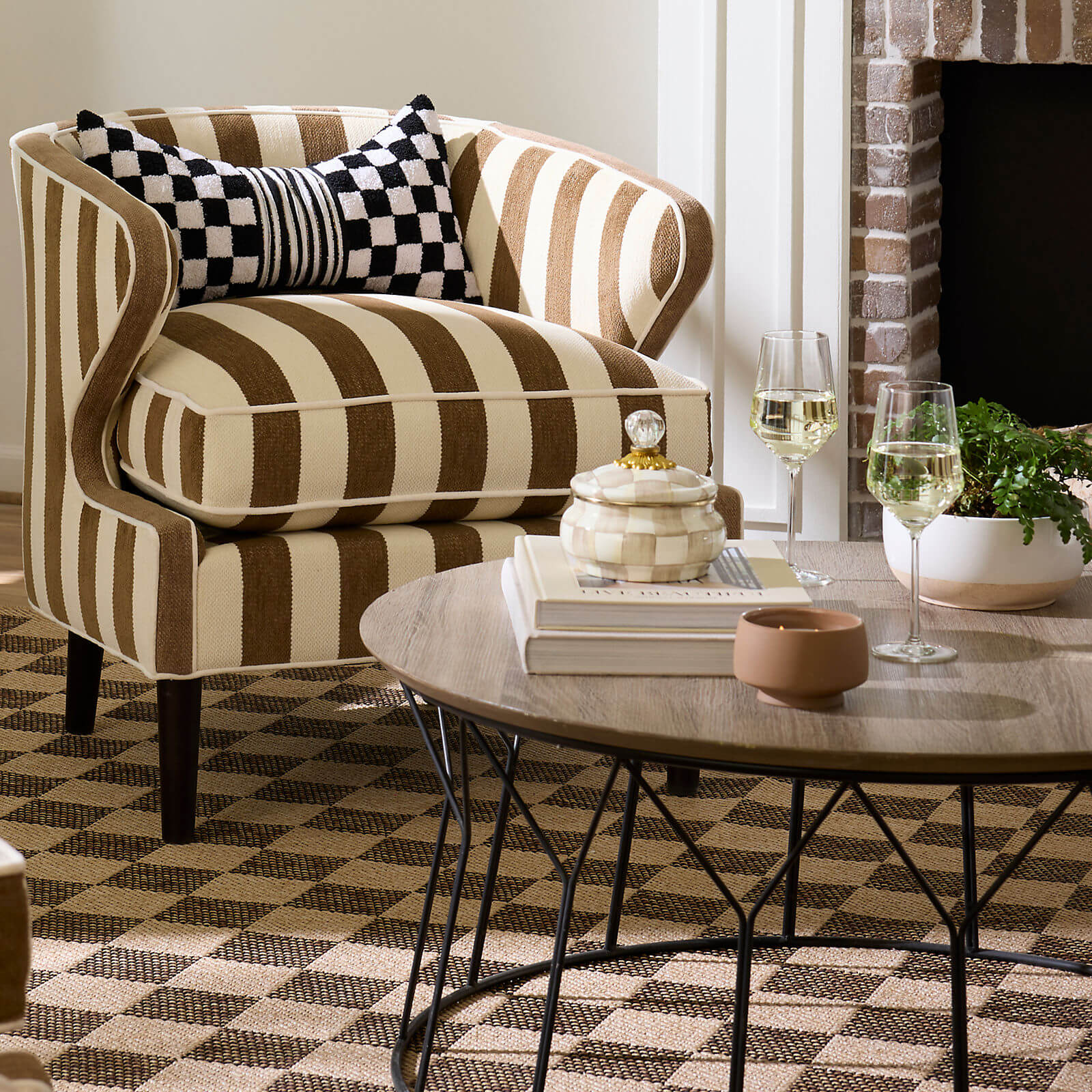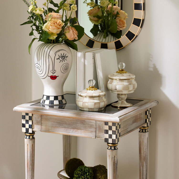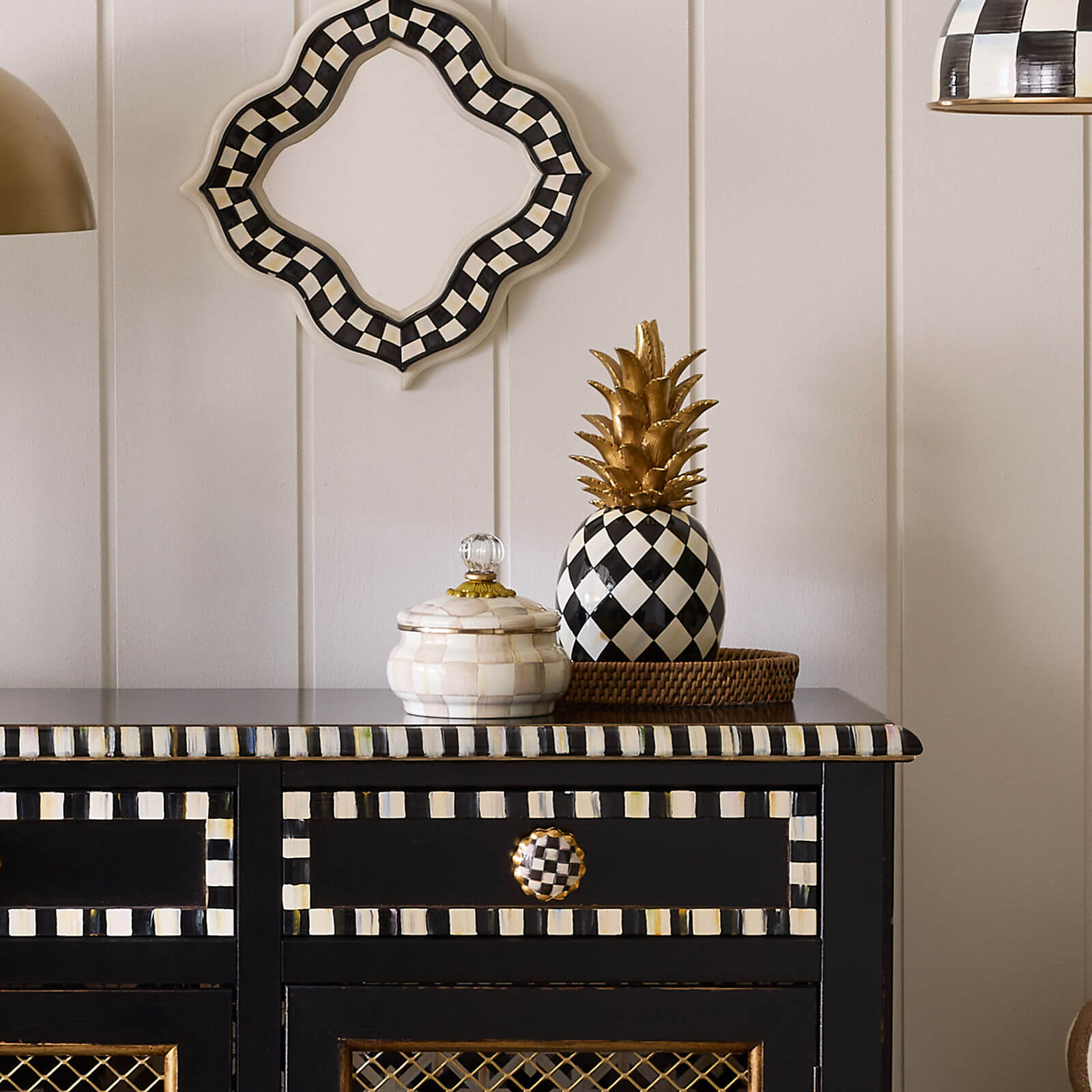 Heavy-gauge, hand-glazed steel underbodwith hand-painted Mocha Checks, rimmed in bronzed stainless steel. Brass and glass accents. Pieces may vary due to the handmade nature of each product. Imported.