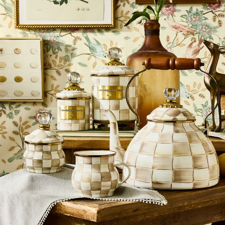 Add to the endless possibilities for our canisters with the Mocha Check Mini Canister. Our smallest sized canister, the Mini stands handsomely alone or harmonizes delightfully in a set. Keep it in the kitchen or invent new uses around the house. Each enameled steel canister is hand-painted with color-dragged, coffee-colored checks and topped with a glass knob.