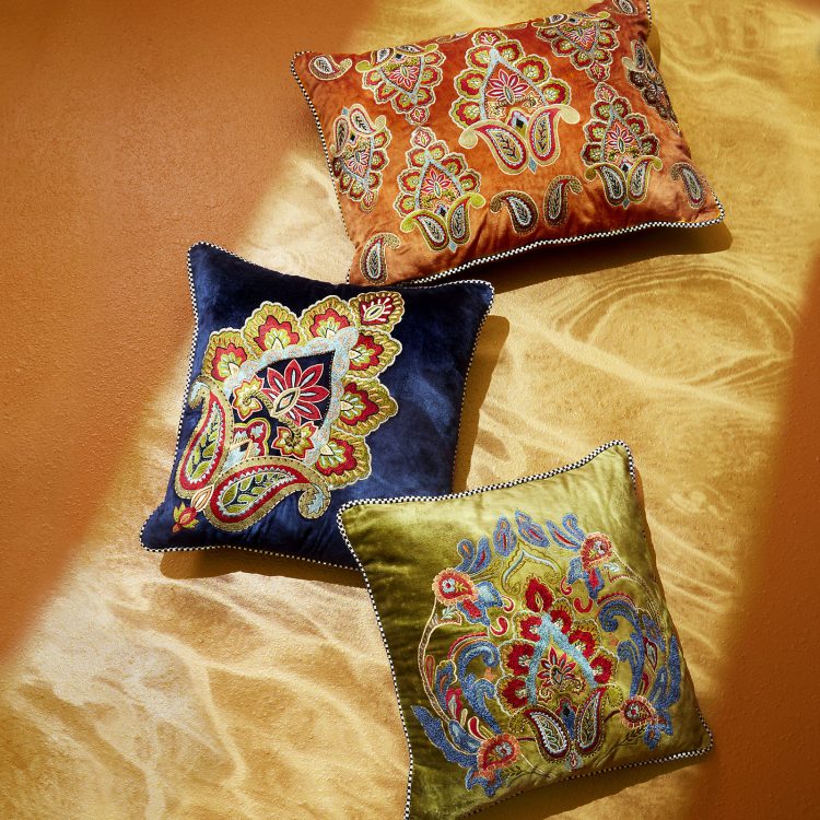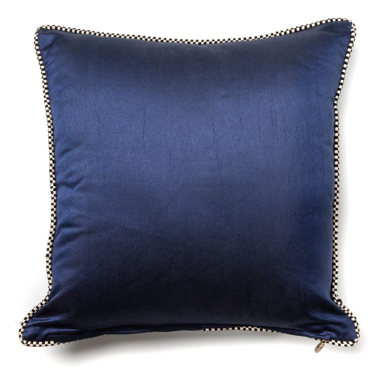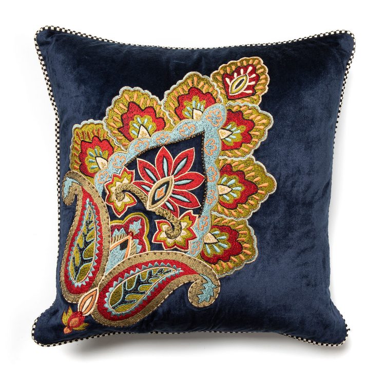 MacKenzie-Childs - Navy Pistache Pillow Description: The Navy Pistache Pillow adds a dark and dramatic pop of color, featuring an embroidered paisley pattern on a navy cotton velvet background. The finishing touch is black and white checked piping.