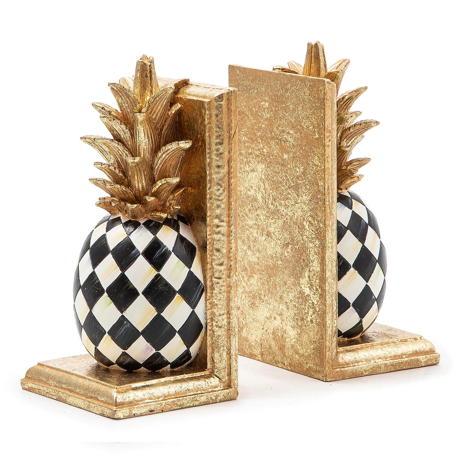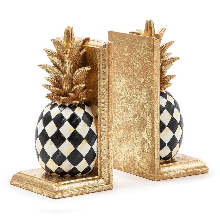 Put books on display stylishly with this set of pineapple bookends, featuring hand-painted harlequin checks and gold leaf on the leaves and bases.