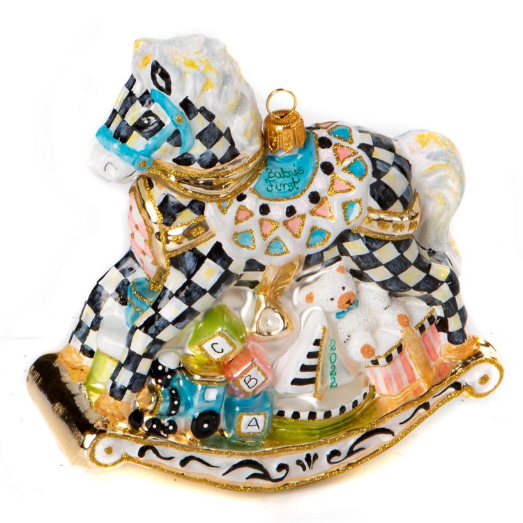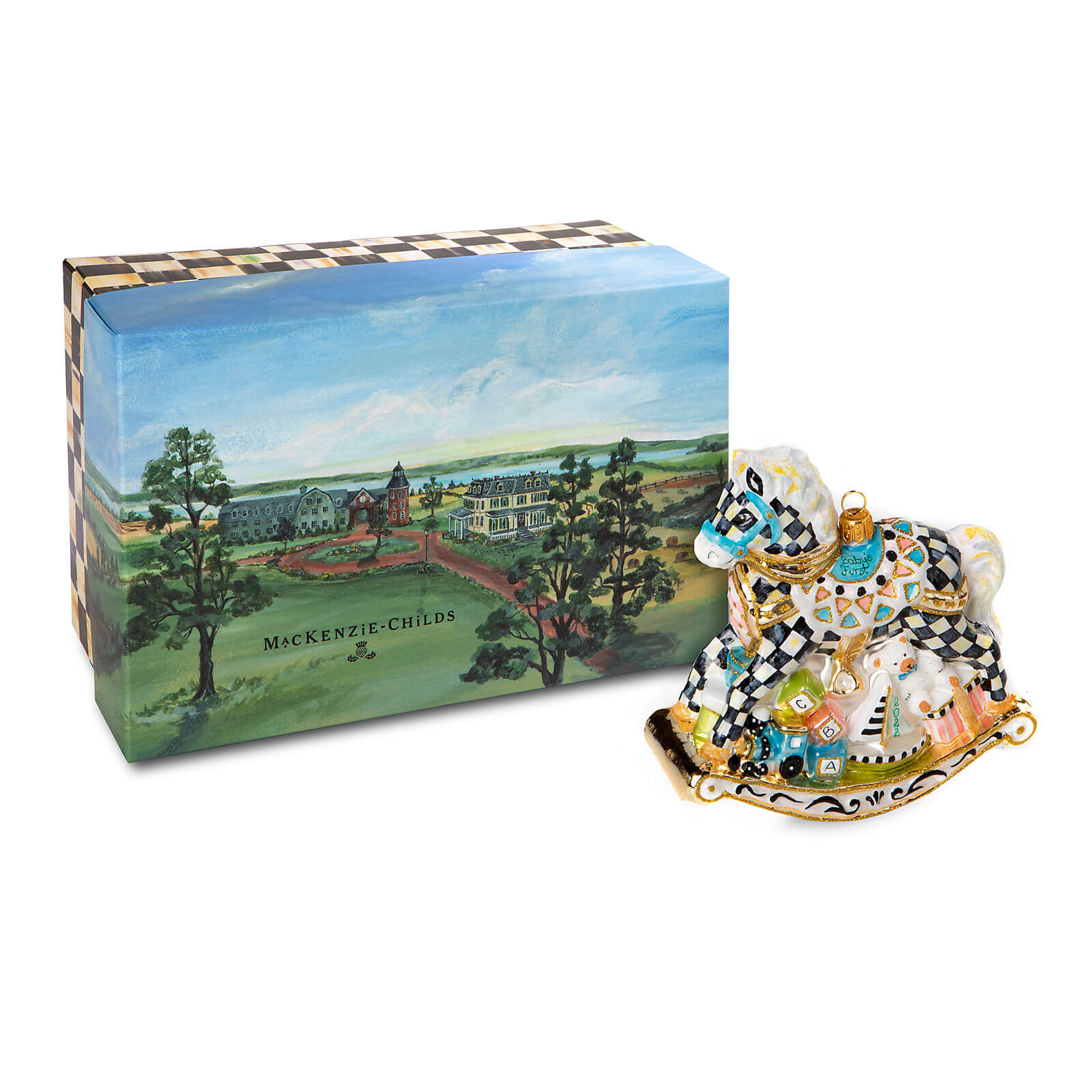 Commit life’s special moments to memory with the Rock A Baby Glass Ornament. Dated 2022, it’s a Courtly Check rocking horse surrounded by gifts. This ornament is finely handcrafted, mouth-blown, and hand-painted in Eastern Europe by some of the world’s most talented glass artisans. Includes a MacKenzie-Childs brass logo charm and keepsake gift/storage box.