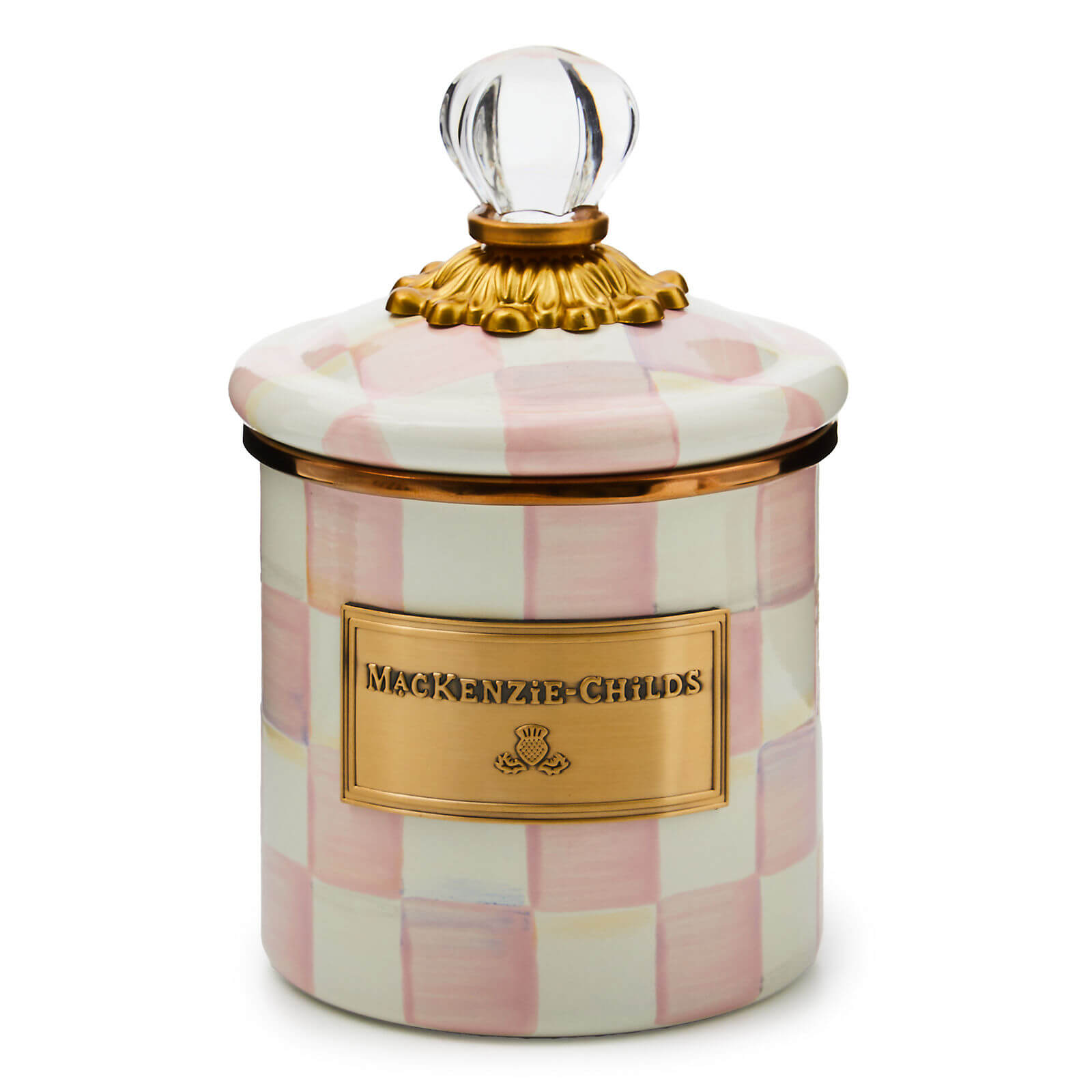 Add to the endless possibilities for our canisters with the Rosy Check Demi Canister. A step up from our smallest sized canister, the Demi stands handsomely alone or harmonizes delightfully in a set. Keep it in the kitchen or invent new uses around the house. Each enameled steel canister is hand-painted with color-dragged checks in a range of rosy hues and topped with a glass knob.