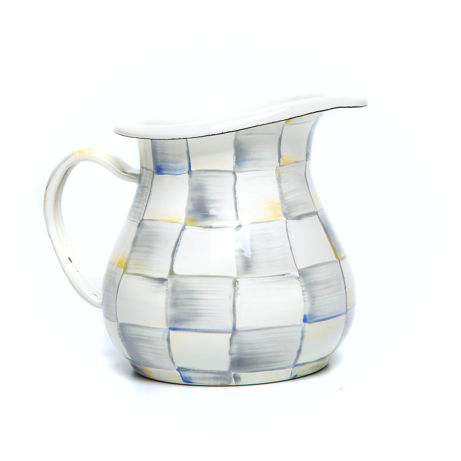 MacKenzie-Childs - Sterling Check Creamer The Sterling Check Enamel Creamer is the perfect way to energize your morning cup of joe. Take your coffee black? Don’t fret—this versatile enamel vessel invites countless uses—from hot fudge to spaghetti sauce to homemade herb vinaigrette. The heavy-gauge steel underbody is glazed with hand-painted, color-dragged checks in subtle shades of grey. Dimensions - 5.75" wide, 4.5" tall, 14 oz. capacity Materials - Heavy-gauge, hand-glazed steel underbody with hand-painted Sterling Checks. Pieces may vary due to the handmade nature of each product. Imported. Care and Use - Hand-wash with mild soap and dry immediately. Our enamelware exceeds both federal food safety regulations and California's Proposition 65, the strictest environmental safety standards in in the U.S. Handle enamelware with care, and discontinue use for food service if it becomes chipped, cracked, or broken.