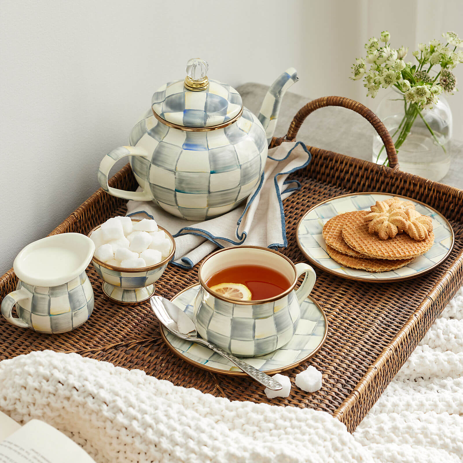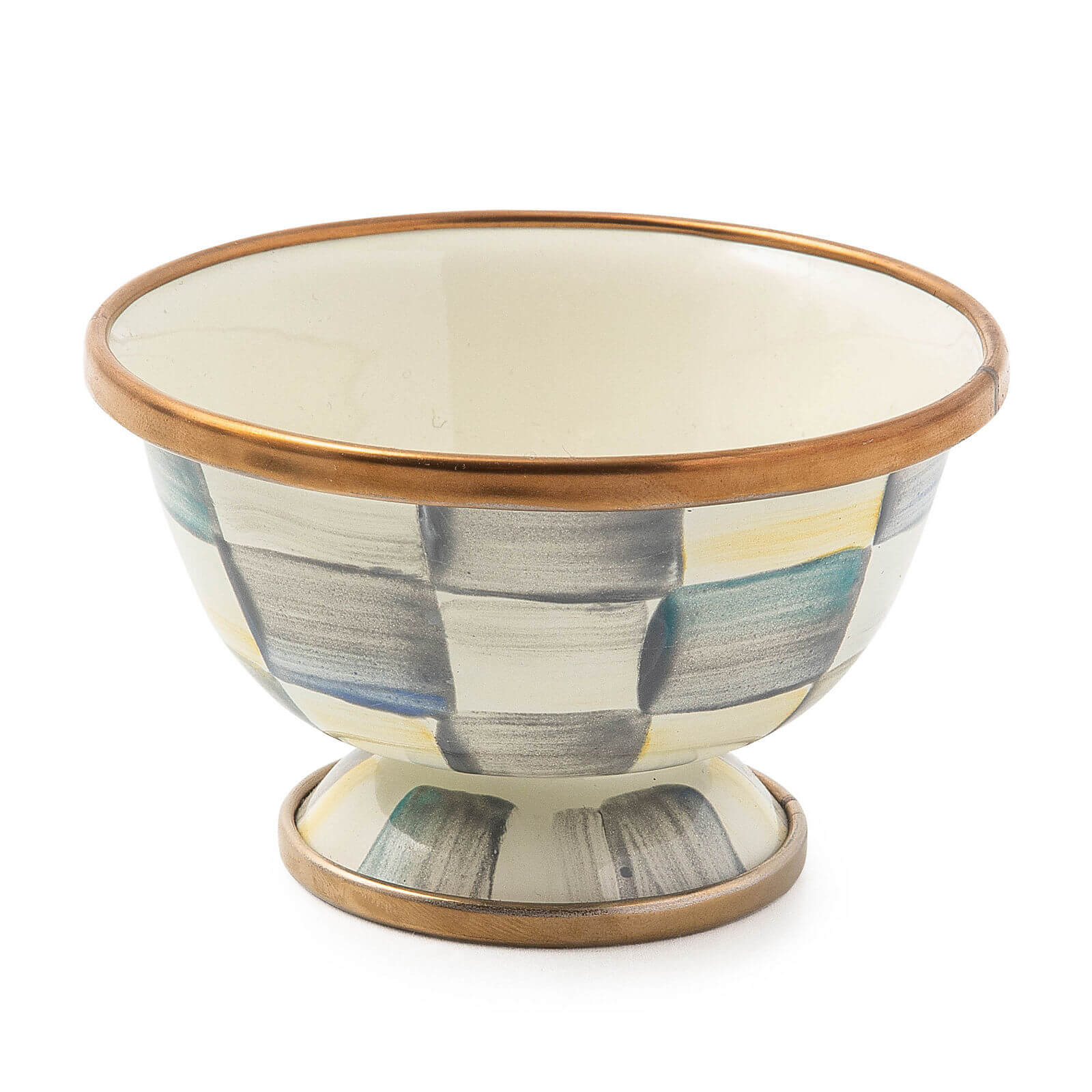 MacKenzie-Childs - Sterling Check Enamel Little Sugar Bowl Dainty only in size, our Sterling Check Little Sugar Bowl is a petite companion to our 4-Cup Teapot and Little Creamer. Made of heavy-gauge steel, it’s hand-painted in a range of sterling-colored checks and rimmed in bronzed stainless steel. Dimensions - 3.25" dia., 2" tall, 4 oz. capacity Materials - Heavy-gauge, hand-glazed steel underbody with hand-painted Sterling Checks, rimmed in bronzed stainless steel. Pieces may vary due to the handmade nature of each product. Imported. Care and Use - Hand-wash with mild soap and dry immediately. Our enamelware exceeds both federal food safety regulations and California's Proposition 65, the strictest environmental safety standards in the U.S. Handle enamelware with care, and discontinue use for food service if it becomes chipped, cracked, or broken.