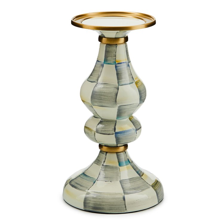 Make an enlightening statement of style by displaying your pillar candles on the Large Sterling Check Enamel Pillar Candlestick. Made of a heavy-gauge, hand-glazed steel underbody with hand-painted grey checks, it’s embellished with brass accents and rimmed in bronzed stainless steel.