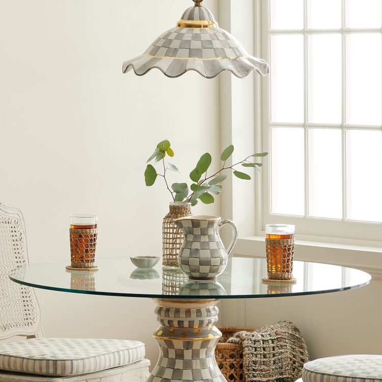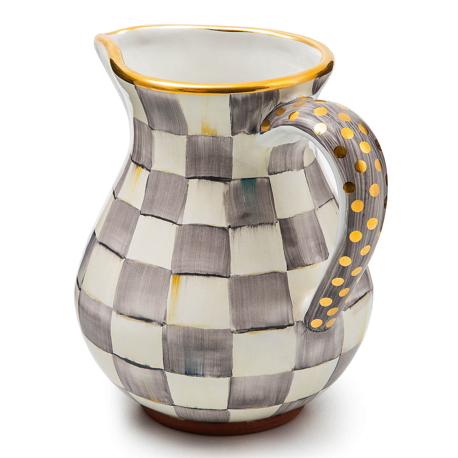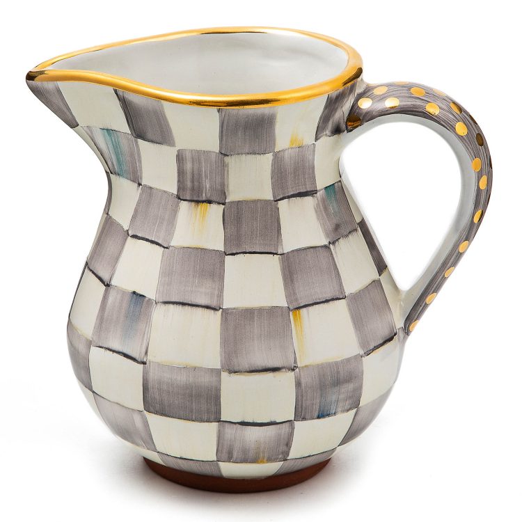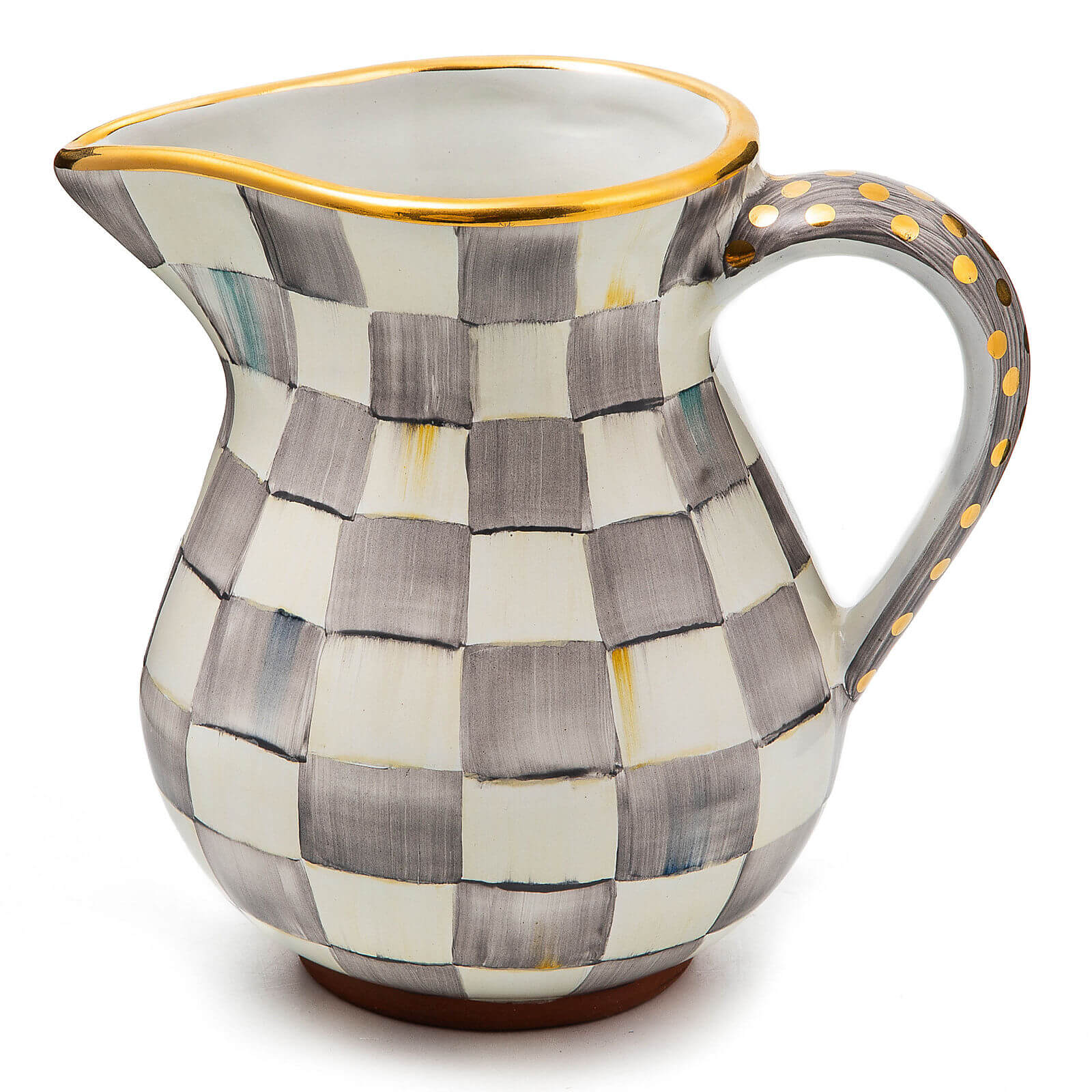Made start to finish in Aurora, New York, the ceramic Sterling Check Portly Pitcher is sized just right for holding water, lemonade, or fresh flowers. Hand-painted with color-dragged grey checks, it’s trimmed with gold lustre dots on the handle.