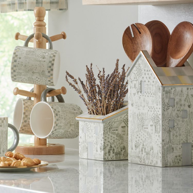 Hold everything from pencils to posies with this short ceramic container, featuring a cottage pattern and trimmed with Sterling Check and gold lustre on the roof.