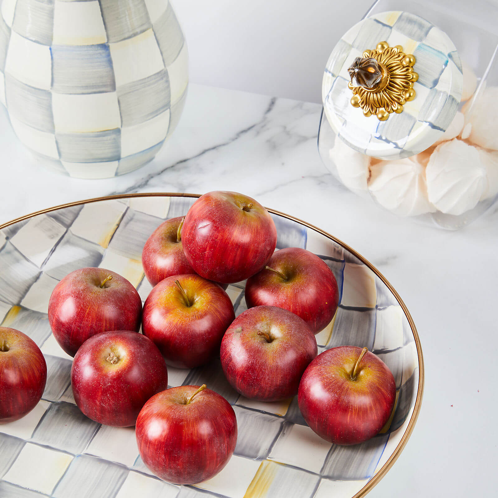 Our Sweets Jar with Sterling Check Enamel Lid is small but mighty and just the right size for holding candies, soaps or office supplies. The half-gallon glass body offers a preview of the tasty goodness in store, and the lid, hand-painted with our color-dragged grey checks and topped with an elegant clear glass knob, lends signature style.