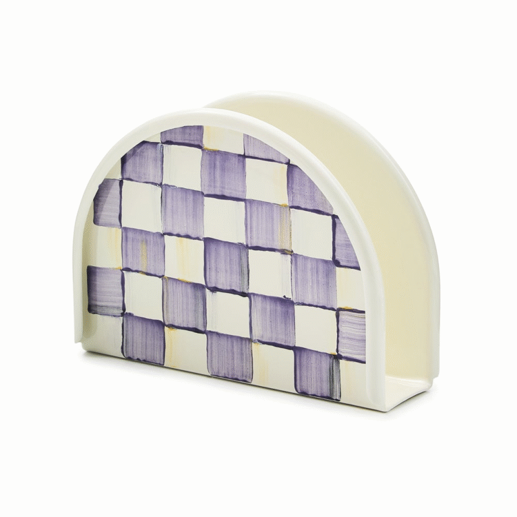 When it comes to staying tidy, our Violet Check Napkin Holder makes table style a snap. It features a heavy-gauge, hand-glazed steel underbody with hand-painted purple checks.