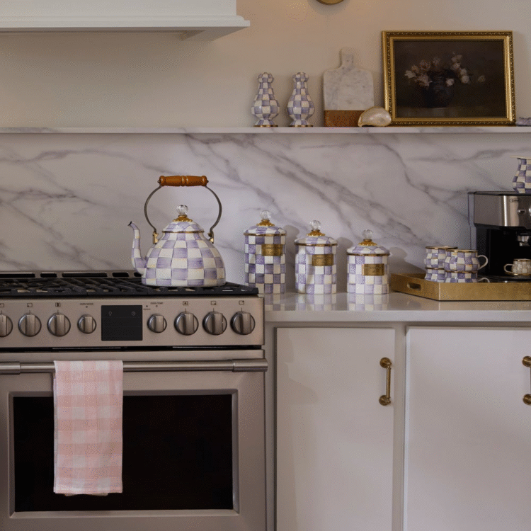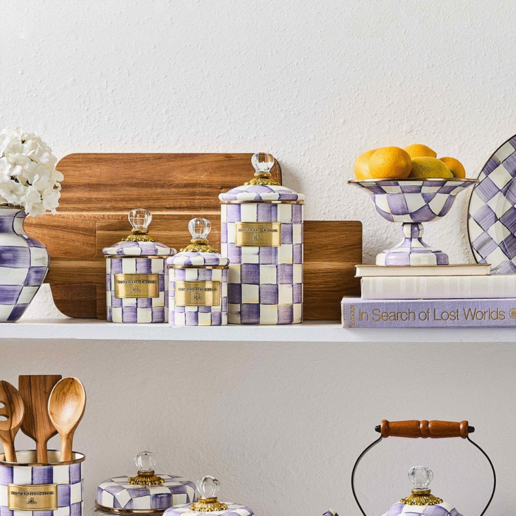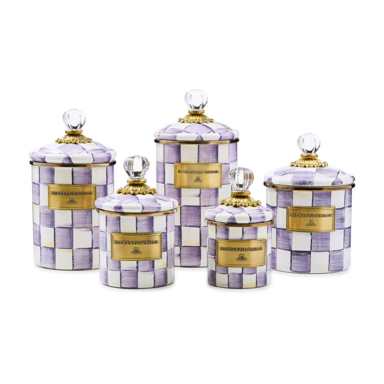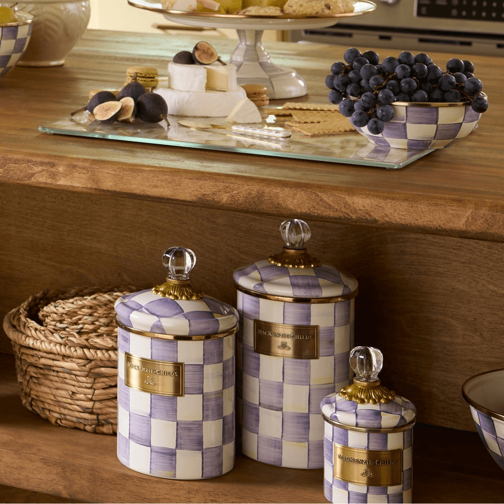 Pantry staples—flour, sugar, and coffee—might seem the most obvious choices with which to fill a Violet Check Large Canister, but the possibilities are endless! Keep it in the kitchen with coffee beans and tea bags, cookies and candies, or dog biscuits and birdseed—or invent new uses around the house. Each enameled steel canister is hand-painted with coffee-colored checks and topped with an elegant clear glass knob.