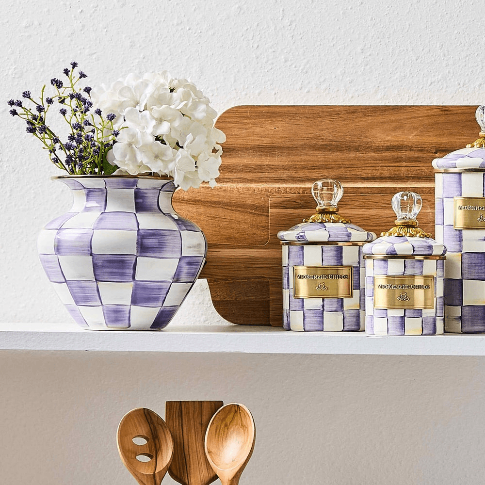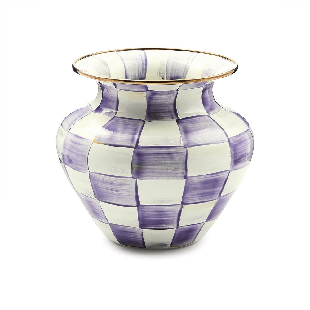 Our Violet Check Large Vase is a just-right-height centerpiece to enhance conversation without getting in the way. With hand-painted purple checks and trimmed with a bronzed rim, it makes the ultimate gift for the host when filled with fresh flowers.