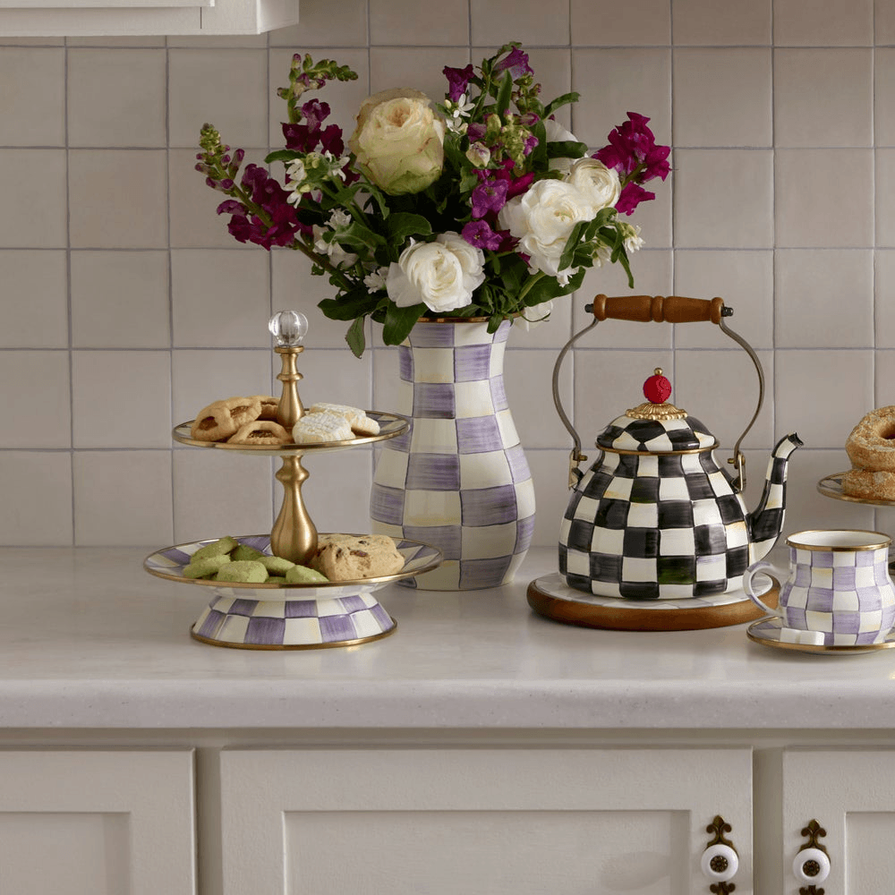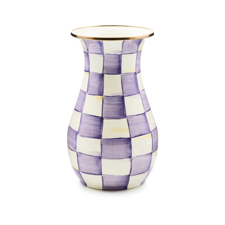 Farm-fresh and inspired by traditional glass milk jugs, the Violet Check Tall Vase is the kind of vase that’s just right for a casual wildflower bouquet, cherry-blossom branches or pussywillow stalks. It’s made of hand-decorated enameled steel with hand-painted purple checks and trimmed with a bronzed rim.