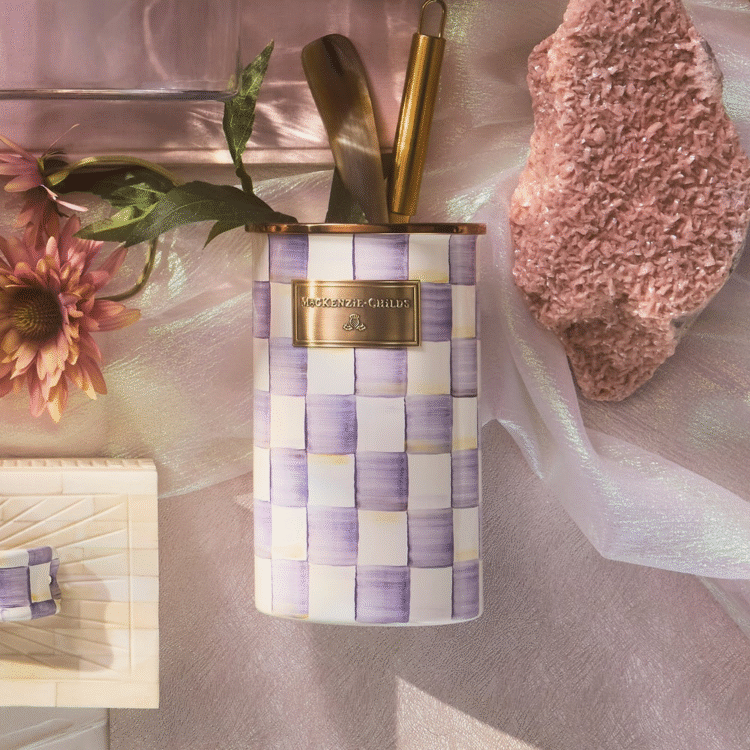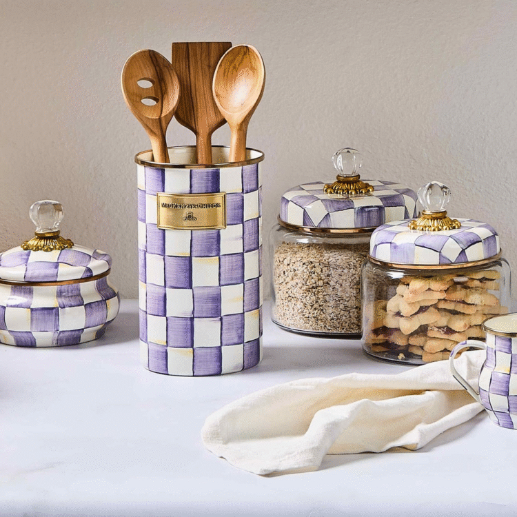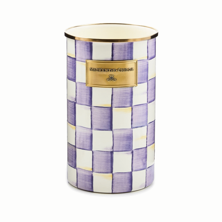 Our extra-tall Violet Check Utensil Holder is the perfect container for everything from slotted spoons to crafting tools. It features hand-painted purple checks on a steel underbody and is rimmed in bronzed stainless steel.