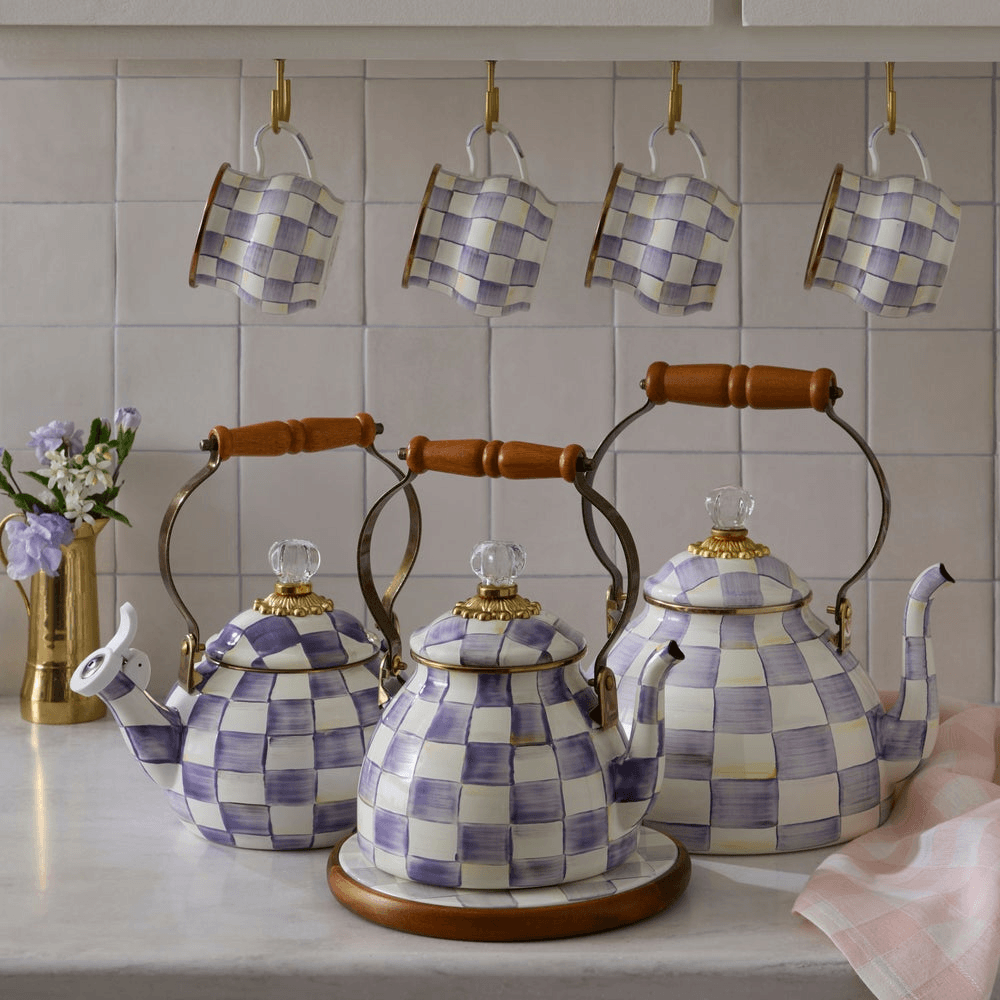 Bubbling over with MacKenzie-Childs style, our Violet Check Whistling Tea Kettle will tell you when it’s time for tea. The heavy-gauge steel underbody is glazed with hand-painted purple checks and topped with an elegant clear glass knob.
