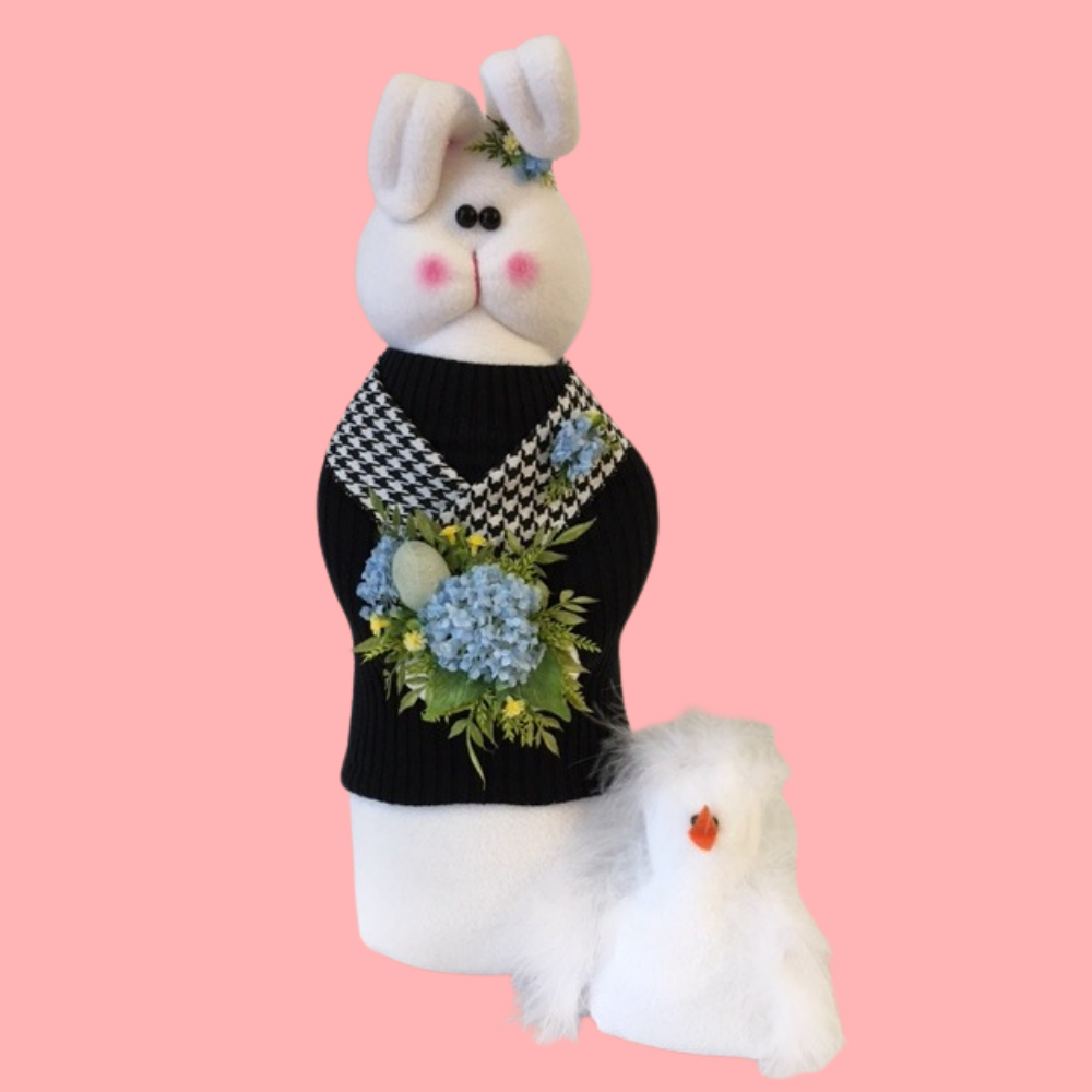 Memories of Elaine - Cheeky Checkers with Peep This Bunny has a classic black sweater accented by a black and white checked scarf.