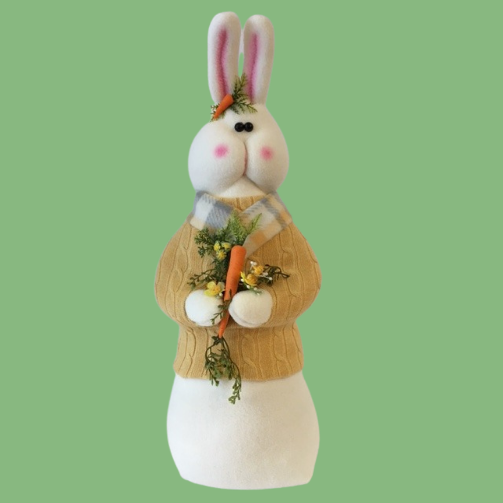 Memories of Elaine - Sweet Carrie Carrie sports a beautiful plaid scarf with her soft gold cable knit sweater, just the right look to for a morning of carrot and flower picking. Dimensions: 19.5" tall x 7" wide x 6" deep