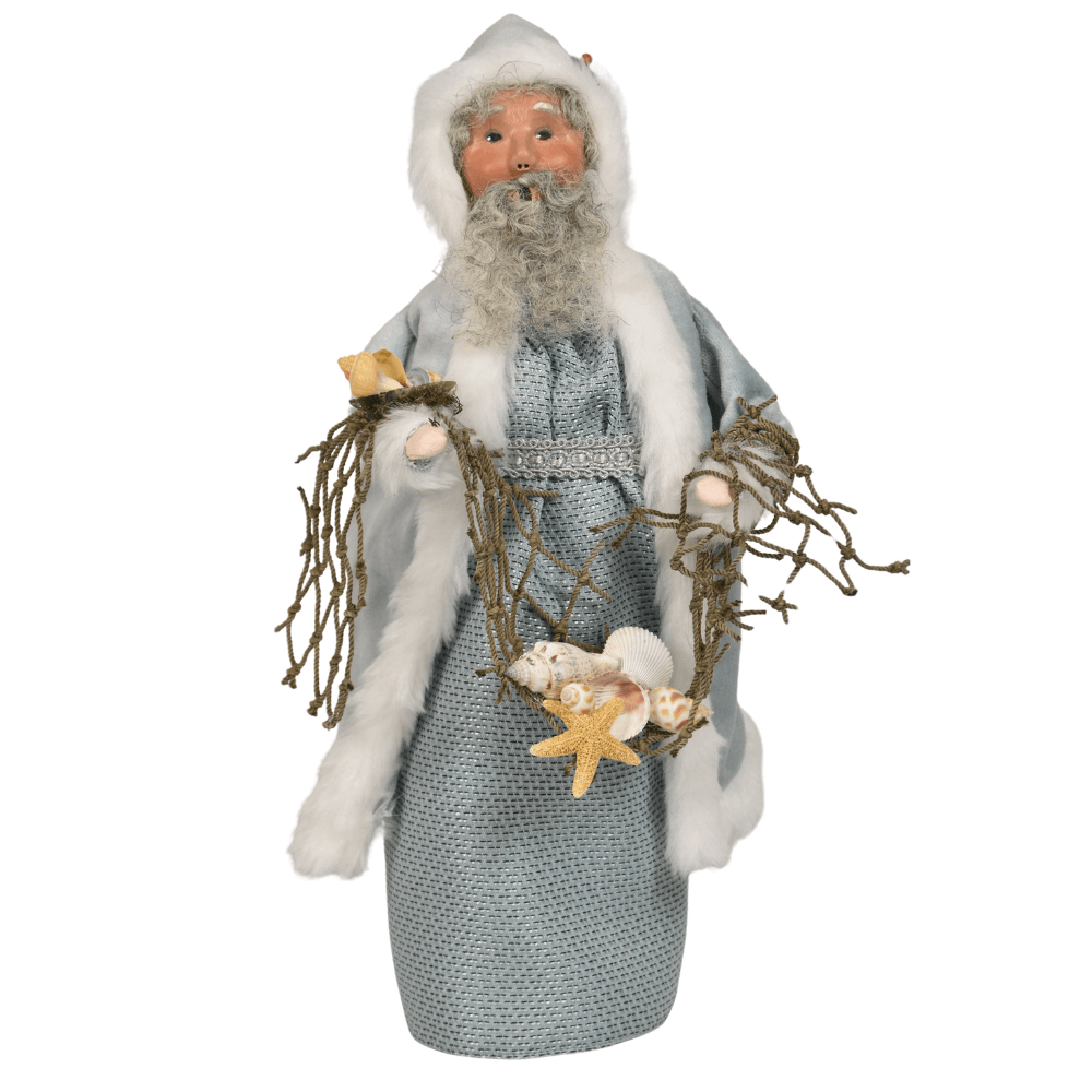 With gentle care, Nautical Santa holds fishing netting filled with seashells and starfish, as if gathering treasures from the shore rather than the snow. This distinctive design blends holiday tradition with coastal charm, celebrating Christmas by the sea and offering a graceful alternative for beach homes, nautical collections, or summer-inspired holiday décor.