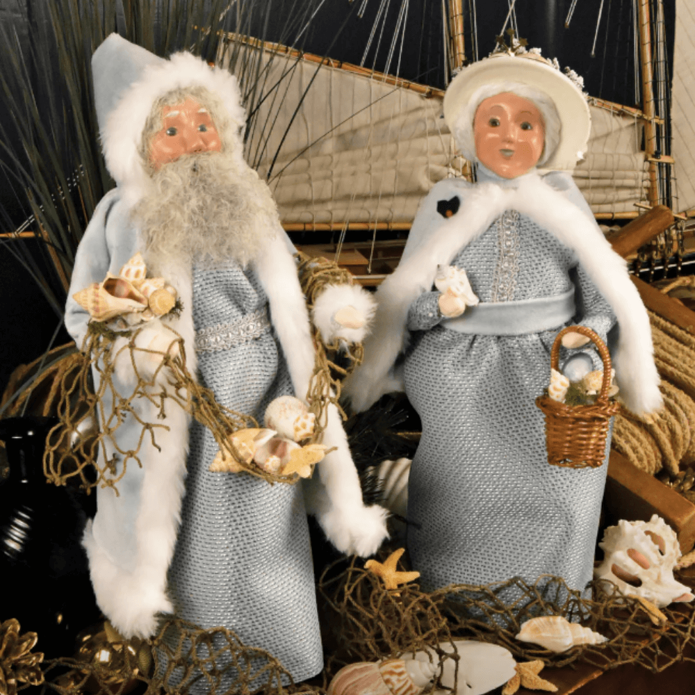 This handcrafted Byers’ Choice Nautical Santa Caroler is festive and perfect for coastal Christmas decorating. Dressed in an elegant light blue nautical coat and gown, he brings a refined seaside twist to traditional holiday displays.