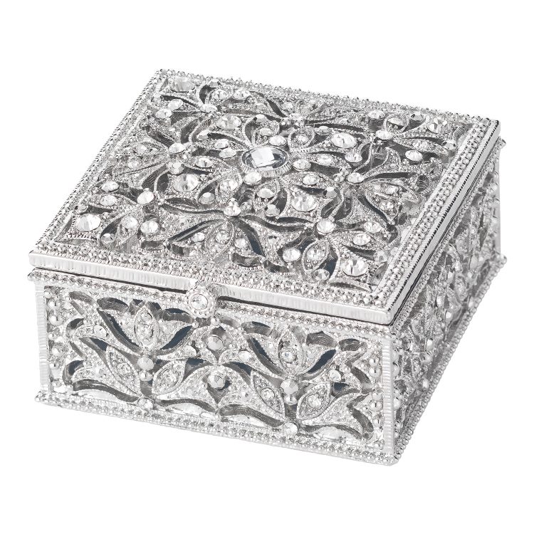Olivia Riegel - Silver Luxembourg Square Box Description: Delightful silver finished pewter filigree box, encrusted with hand-set clear European crystals. Hinged lid. Blue hand-enameled interior. Tarnish resistant. Signature luxury gift box included. 3"L x 2.75"W x 1.5"H Weight: 0.6 lb (includes gift box)