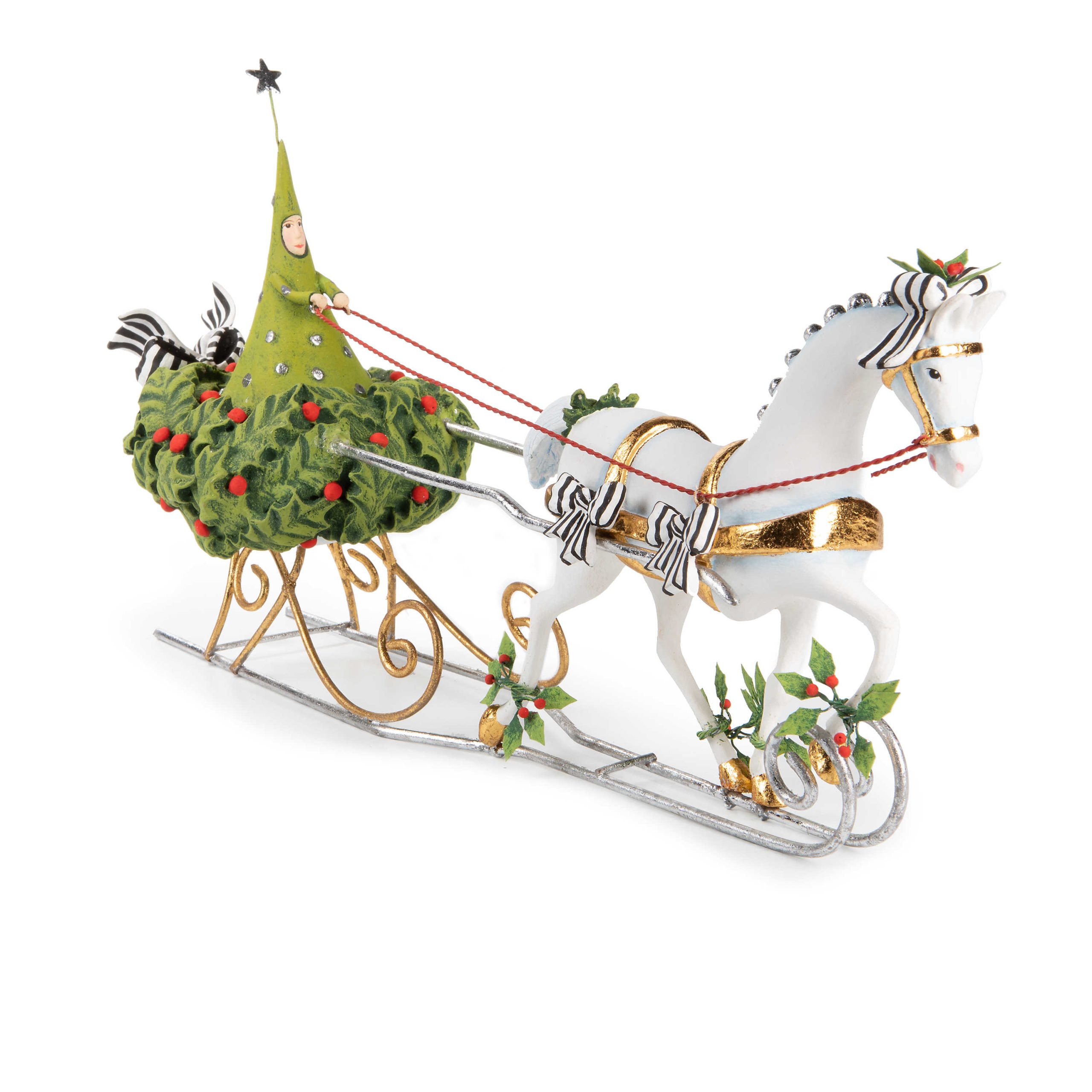 Oh, what fun is the Patience Brewster Jingle Bells Sleigh with Tree Figure. Inspired by Patience’s childhood memories of growing up on a horse farm, this handmade and hand-painted figure features a one-horse holly wreath sleigh driven by a fanciful tree. Display it on a mantel or tabletop to make the holidays jingle all the way.