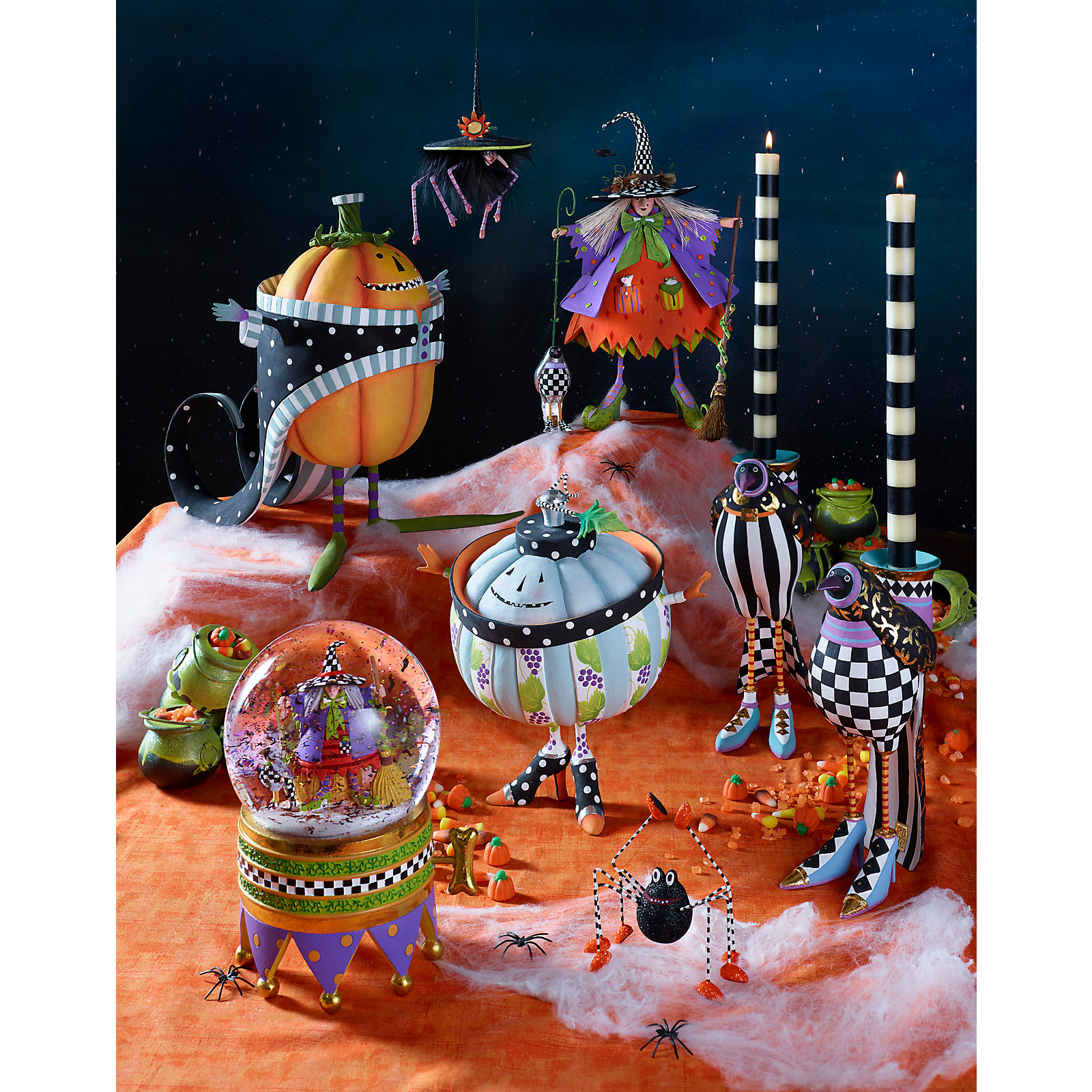 The Patience Brewster Raggedy Witch Figure has spooky autumn style that extends from her checked hat with a tiny bats to her chartreuse high heels. She wears a raggedy outfit in layers of chartreuse, orange, and purple, and carries her pet crow and her ever-handy broom. She will magically complete your halloween display!