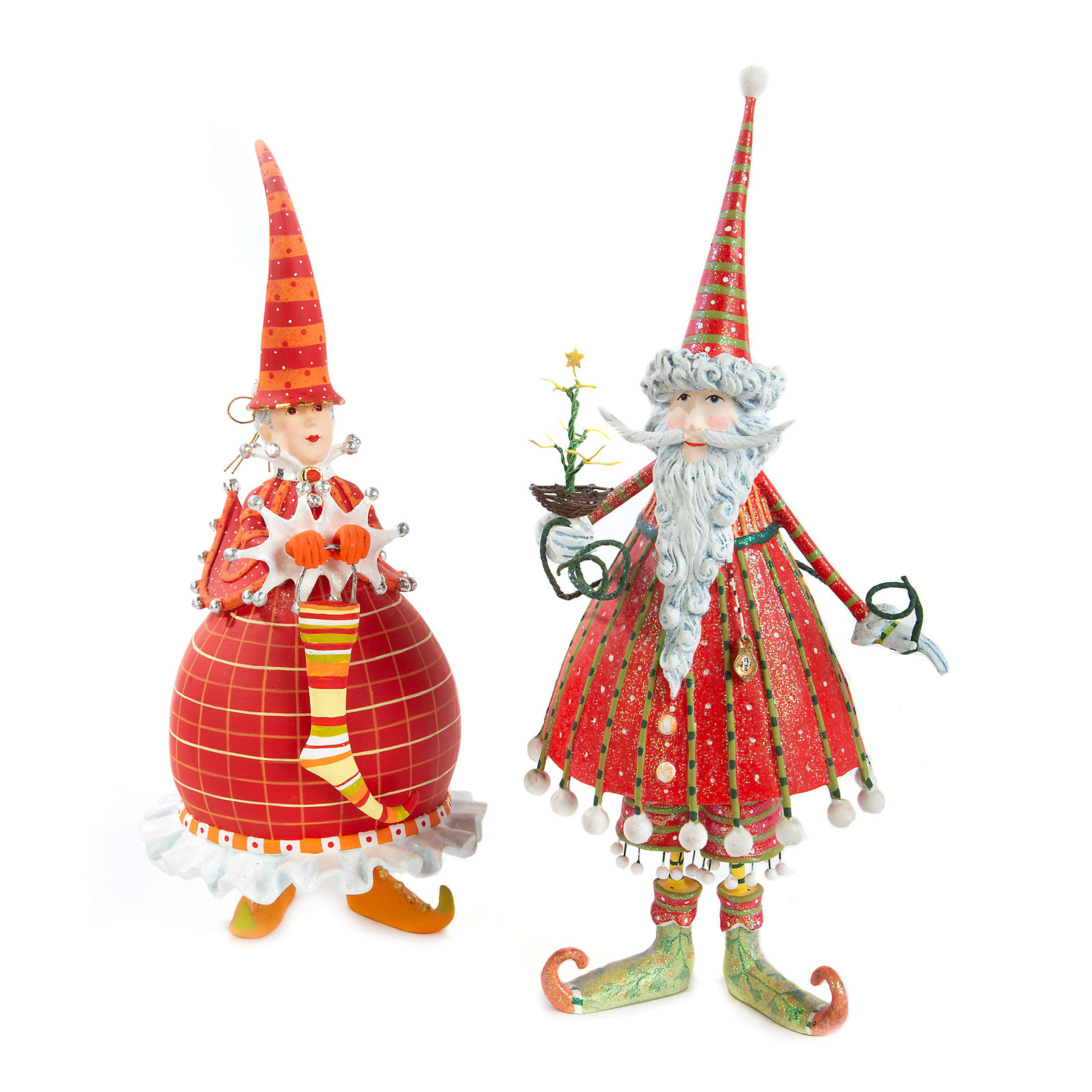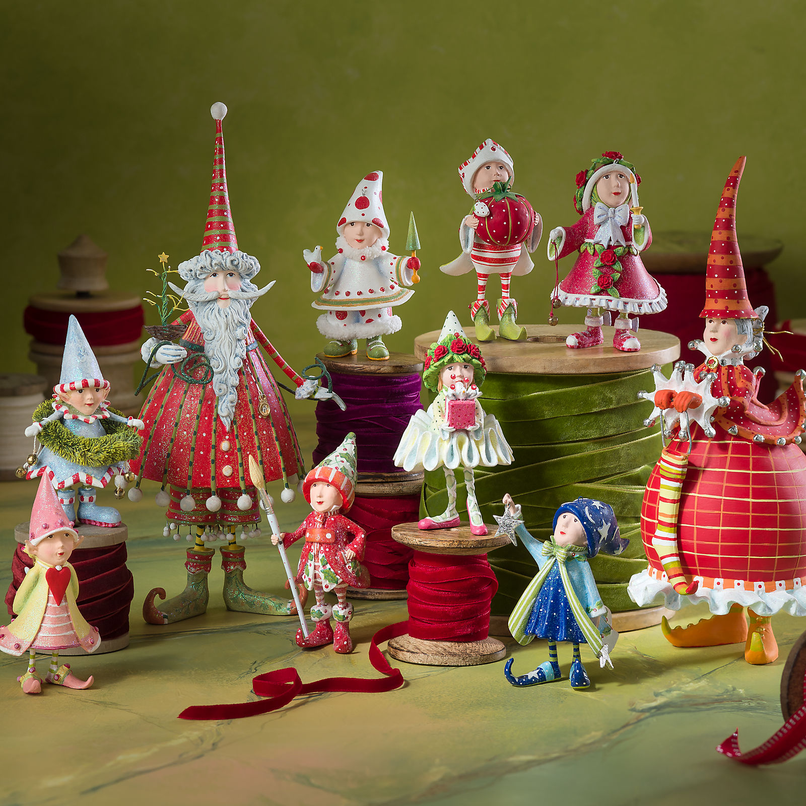 Patience Brewster - Red Mrs. Santa with Stocking Figure Dash Away, inspired by the Christmas classic “Twas the Night Before Christmas,” features Santa’s eight reindeer ready to take flight around the world, assisted by their delightfully dedicated elves, Santa, and Mrs. Santa. The Patience Brewster Dash Away Red Mrs. Santa Figure has a red plaid bustle to coordinate with her orange and red cap and jacket. (She comes in white as Candlelight Mrs. Santa.) In her gloved hands, she carries a striped stocking she has just finished knitting in time to fill for Christmas. She pairs nicely with all Dash Away figures, but especially Nicholas Santa. Dimensions: 10.5" tall Materials: Stone and resin. Handmade and painted in the Philippines. Care and Use: Dust with soft cloth