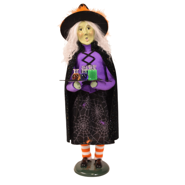 This handcrafted Byers’ Choice Potions Master Witch Caroler is festive and perfect for Halloween decorating. Holding a tray of freshly brewed, colorful potions, she brings a touch of spellbinding magic and playful mystery to seasonal displays. Dressed in a sparkling black cape with a spider web patterned skirt, this Potions Master Witch appears mid-spell as she prepares her latest magical creations. Standing beside her potions table, she captures the fun of candlelit workshops, bubbling brews, and the whimsical artistry of Halloween making her a perfect centerpiece for witchy scenes and imaginative autumn displays. Ships June 1