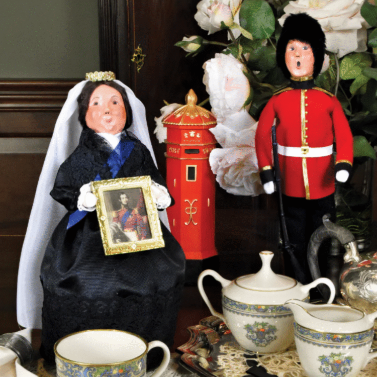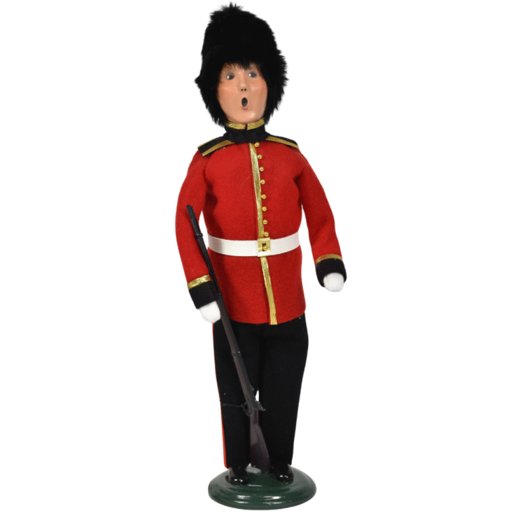 This handcrafted Byers’ Choice Royal Guard Caroler is a timeless portrayal of ceremonial duty and tradition for the Royal Family. Standing steadfast beside Queen Victoria, he brings regal presence and historic elegance to Victorian and heritage inspired displays. Wearing his iconic uniform and holding his rifle at attention, this Royal Guardsman embodies loyalty, discipline, and honor. His poised stance reflects the ceremonial role of the Guard during Queen Victoria’s reign, and together they evoke the dignity, devotion, and enduring legacy that defined Britain’s Victorian era.