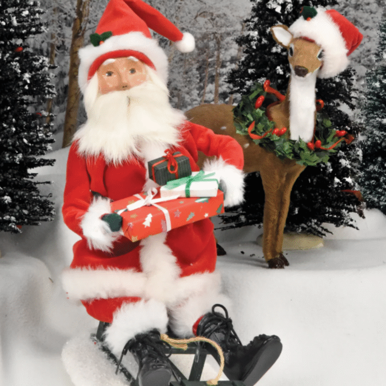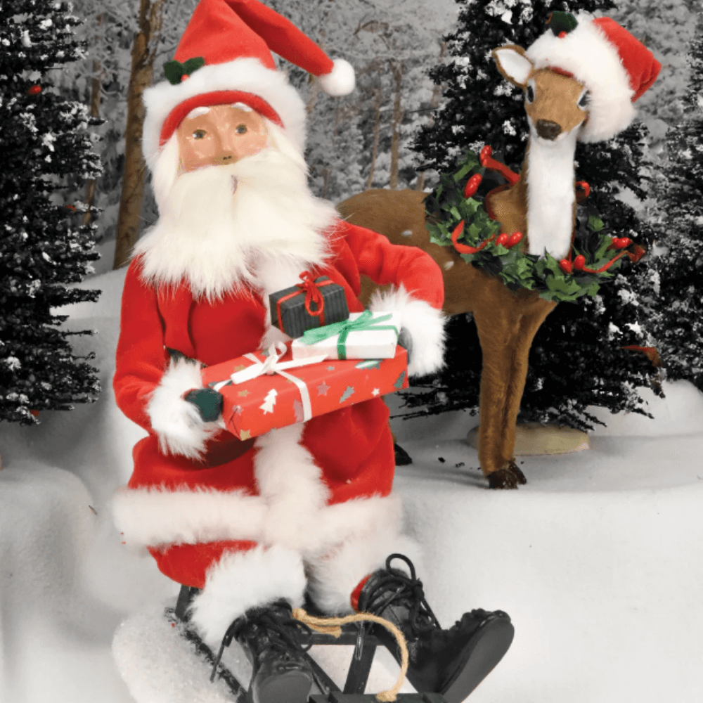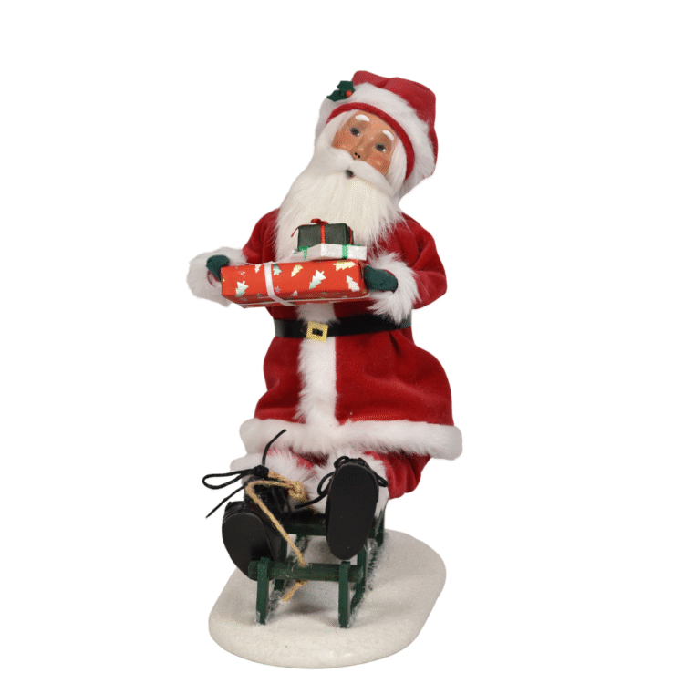 This handcrafted Byers’ Choice Santa On Sled Caroler is festive and perfect for Christmas decorating. Captured mid-glide on a snowy hill, he adds playful motion and joyful energy to winter and holiday displays.