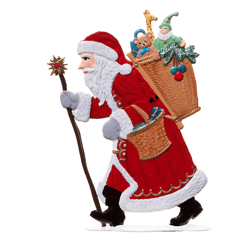 Striding Santa by Wilhelm Schweizer is hand cast, hand painted, imported pewter from Bavaria in Germany. Experience the magic of this festive season with a charming depiction of joy and generosity. This lovingly crafted figurine depicts a lively walker laden with gifts and festive accessories, eager to bring joy to any home. Colors may vary from the image shown since each piece is individually hand painted. Gift box included. Dimensions: 2″W x 3 3/4″H