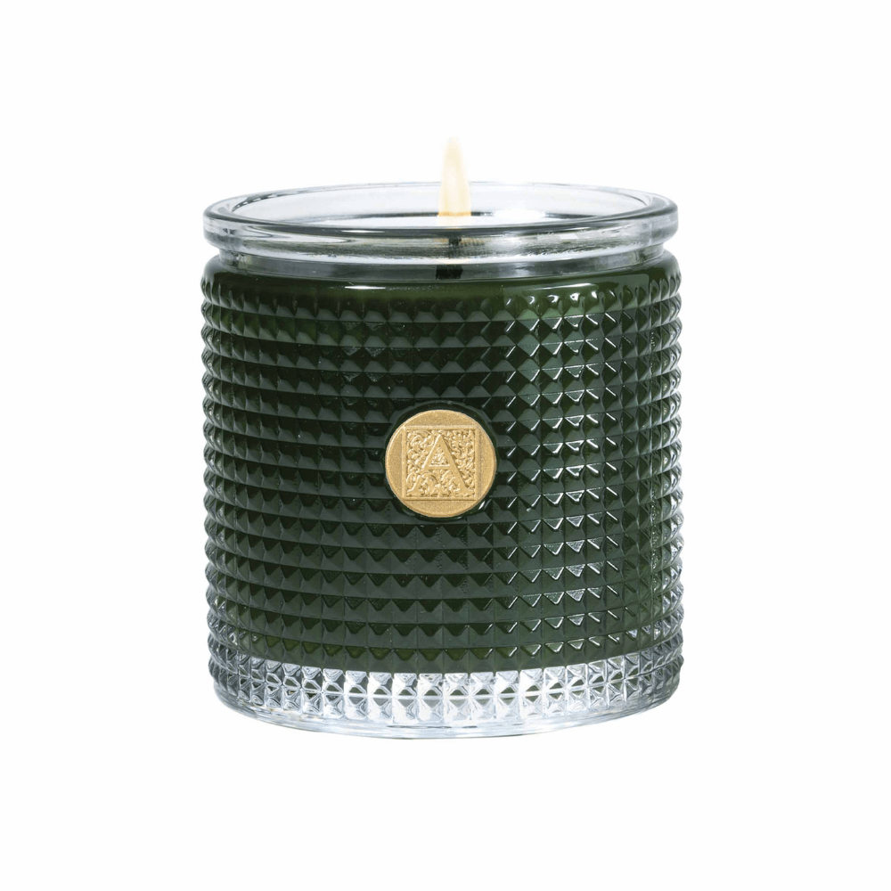The Smell of Tree® Textured Glass Candle brings the outside in with the fragrance of freshly cut wild evergreen. Our candles are all hand-poured in Arkansas. Made with a proprietary wax blend, ethically sourced containers and cotton wicks. Light one of these aromatic candles and transport yourself to a memory or emotion. Directions: Always burn on a heat resistant surface and trim wick to 1/4" before each use. Allow wax to pool to the edge each burn for maximum use and to avoid tunneling. Fragrance Notes: Pine, Cedarleaf, Fir Balsam, Bayleaf, Clove, Moss Details: Up to 40 hours of burn time; dark green wax; 6 oz; textured glass cylinder with medallion; 3” D x 3.25” H; not tested on animals