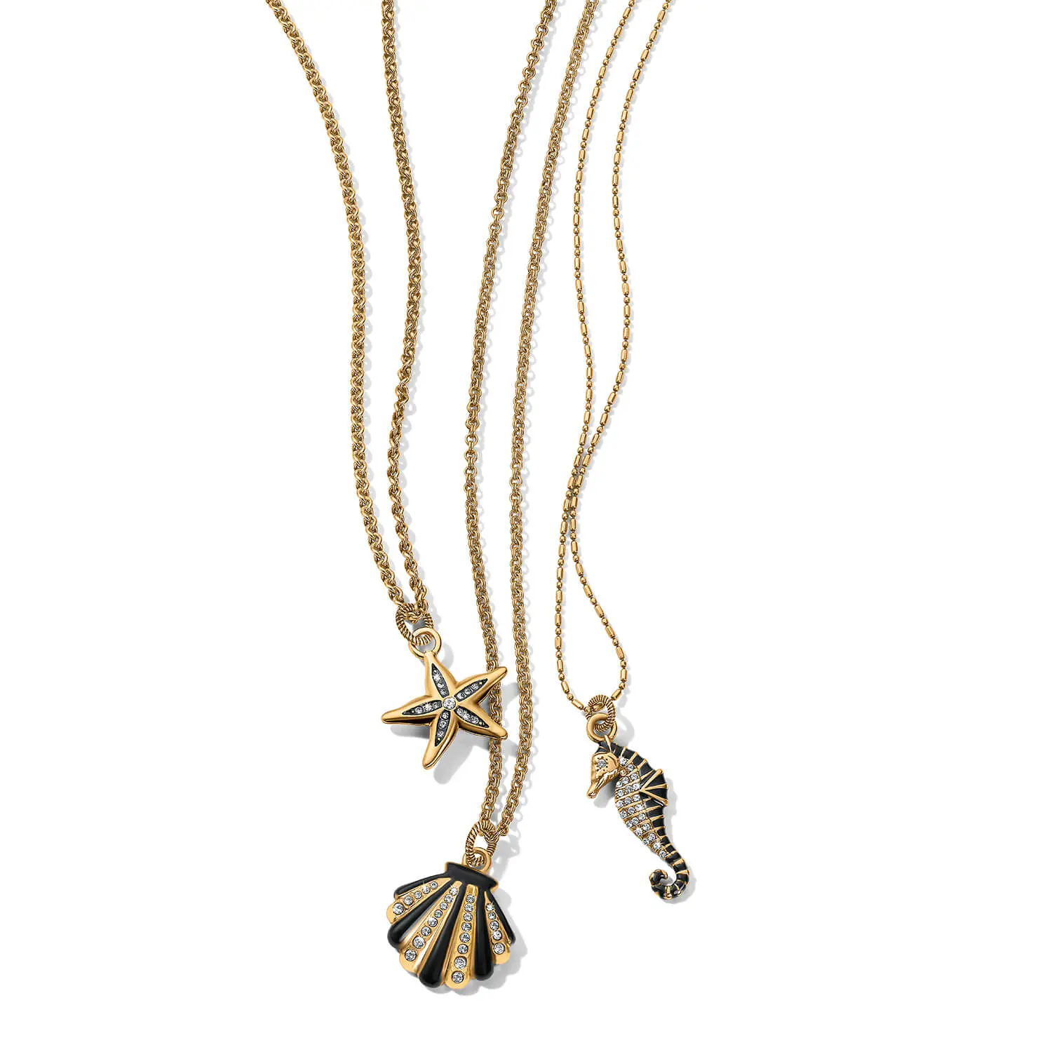 Our designer Lisa Spayd-Sendre has collected shells all her life and reimagined them in this seahorse necklace with artisan black enamel and pave crystals.