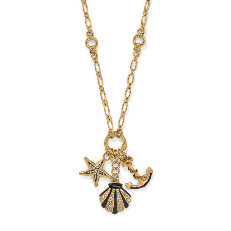 Our designer Lisa Spayd-Sendre has collected shells all her life and reimagined them in these beachy charms necklace with artisan black enamel and pave crystals. Color: Gold-Black Closure: Lobster Claw Length: 16" - 18" Adjustable Pendant Drop: 1 3/4" Material: Fine quality crystal, Enamel Finish: Gold plated
