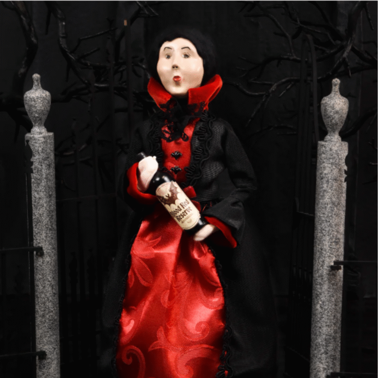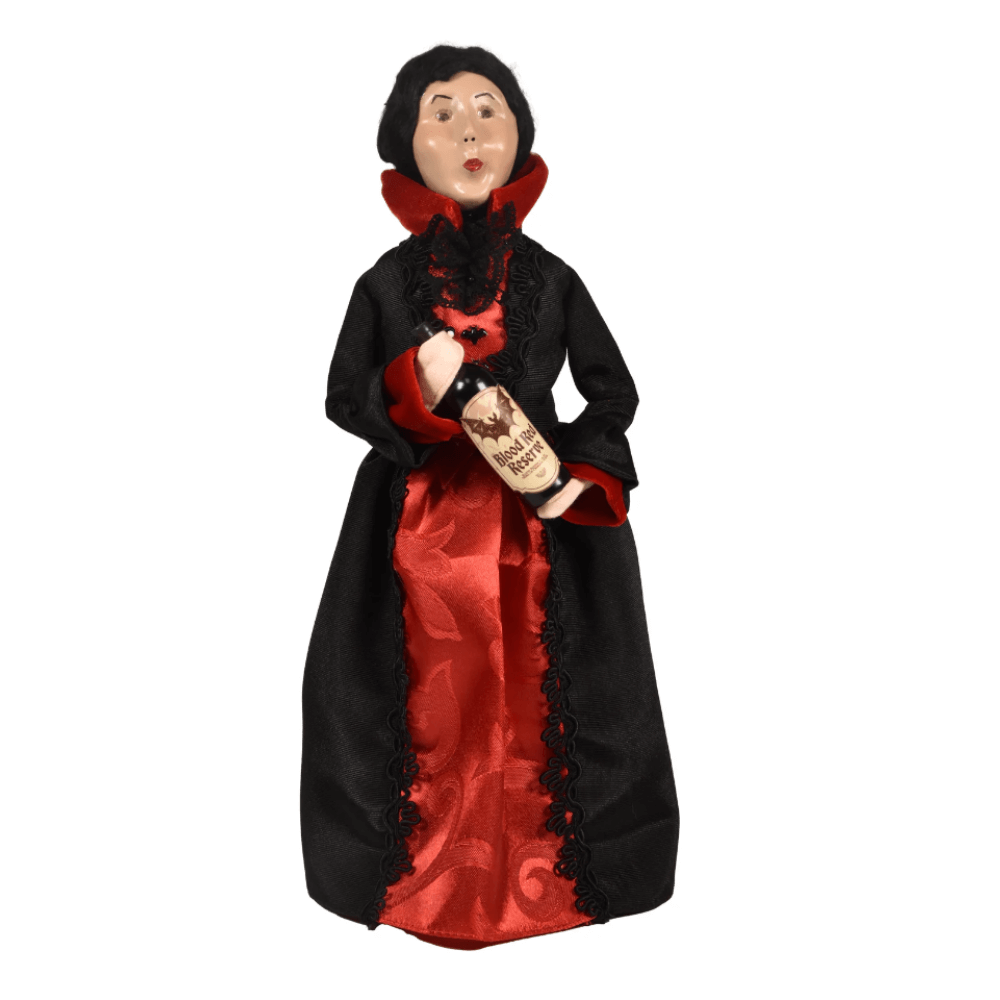 This handcrafted Byers’ Choice Vampiress Caroler is elegant and perfect for the Halloween holiday season. Dressed in a dramatic black and crimson gown adorned with bat-shaped buttons, she clutches a bottle of “Blood Red Reserve” wine, her ruby lips adding to her chilling allure. A striking companion to Count Dracula, she brings gothic glamour to your Halloween displays. The Vampiress embodies the timeless mystique of gothic folklore, a queen of the night who thrives in the shadows alongside her infamous counterpart, Count Dracula. With her refined presence and sinister charm, she represents the darkly romantic side of Halloween—where elegance and fright entwine. Ships June 1