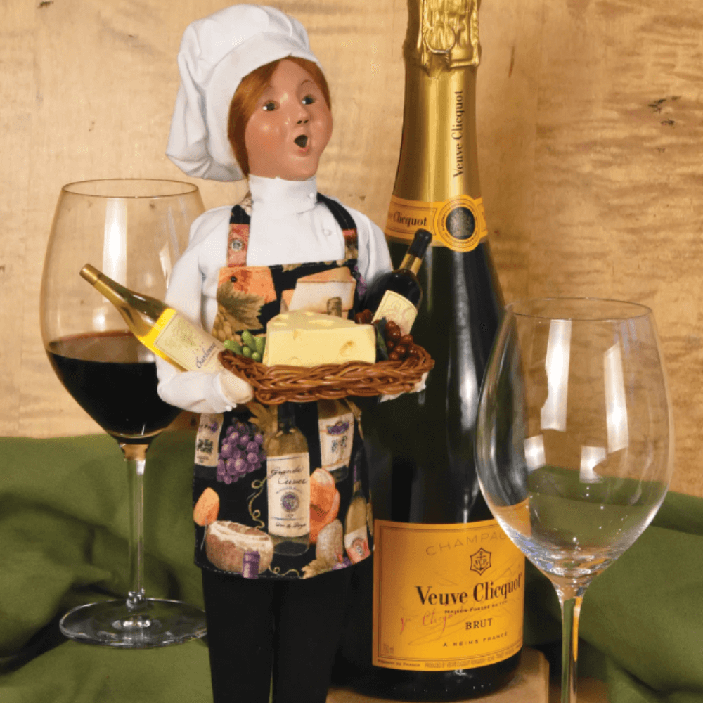 This handcrafted Byers’ Choice Wine & Cheese Chef Caroler is festive and perfect for kitchen decor and entertaining-themed or seasonal displays. With bottles of red and white wine tucked under her arms and a basket of cheese and grapes in hand, she brings warmth and hospitality to any gathering. Dressed in her cheerful themed apron and classic chef’s hat, this gracious hostess arrives ready to welcome friends and family. She captures the inviting spirit of shared meals, lively conversation, and the simple joy of coming together. Celebrating the season with good food, good company, and timeless tradition.