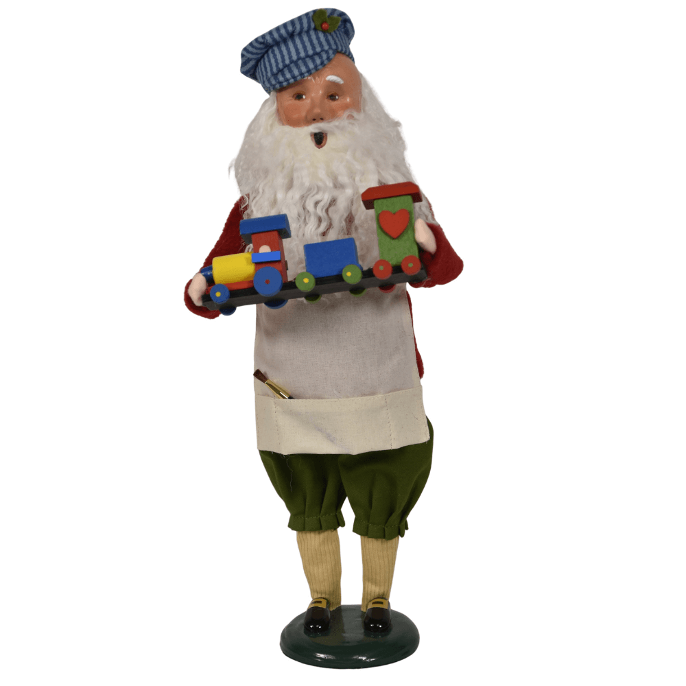 This handcrafted Byers’ Choice Workshop Santa Caroler is festive and perfect for Christmas decorating. Wearing his work smock and train conductor hat, he holds a freshly painted toy train, capturing the creative heart of Santa’s workshop.