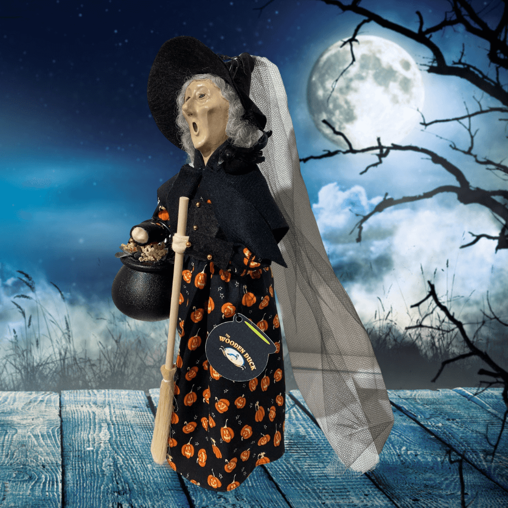 Joyce Byers and Jane Berger have once again collaborated on designing a bewitching Halloween Caroler produced exclusively for the Wooden Duck. Introducing "Winifred”, she is ready to cast a little mischief and a lot of charm this Halloween season. With a black crow perched on her shoulder, “Winifred” swoops down from the twilight sky and wanders the streets below in search of unsuspecting victims. Can you hear the ghosts and goblins darting about as they admire her black gown accented with orange pumpkins, her black shawl covering her shriveled arms, and her lengthy veil? The poisonous black spider atop her crushed hat is awaiting a perfect location to spin her web; could it be your home. Halloween may be months away, but don’t hesitate as "Winifred" is a limited edition and of limited quantities! Comes with a caldron hangtag.