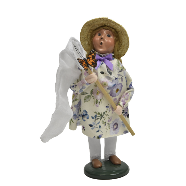 This handcrafted Byers’ Choice Butterfly Girl Caroler is festive and perfect for the Spring and Summer holiday seasons. Wearing a cheerful floral-themed dress and holding a butterfly net, she captures the playful spirit of a sunny day spent exploring nature. A bright butterfly has landed in her net, adding charm and color to your seasonal decorating. This whimsical figurine celebrates the joy of childhood wonder and the beauty of the natural world. Inspired by the carefree days of spring and summer, Butterfly Girl brings a sense of freshness and renewal to any collection—perfect for windowsills, mantels, or garden-themed displays.