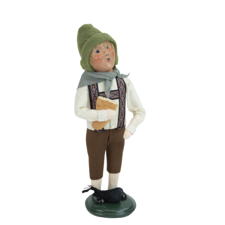 This handcrafted Byers’ Choice Hansel Caroler is festive and perfect for the Halloween holiday season. Inspired by the classic fairy tale, he’s dressed in traditional German-style clothing and carries a loaf of bread, ready to outwit any witch he may encounter. Hansel is one half of the beloved sibling duo from the Brothers Grimm’s enduring tale Hansel and Gretel. His cleverness and bravery have captured imaginations for generations. This figurine brings a storybook charm to your seasonal décor, making it a sweet addition to any Halloween or fairy tale-inspired display.