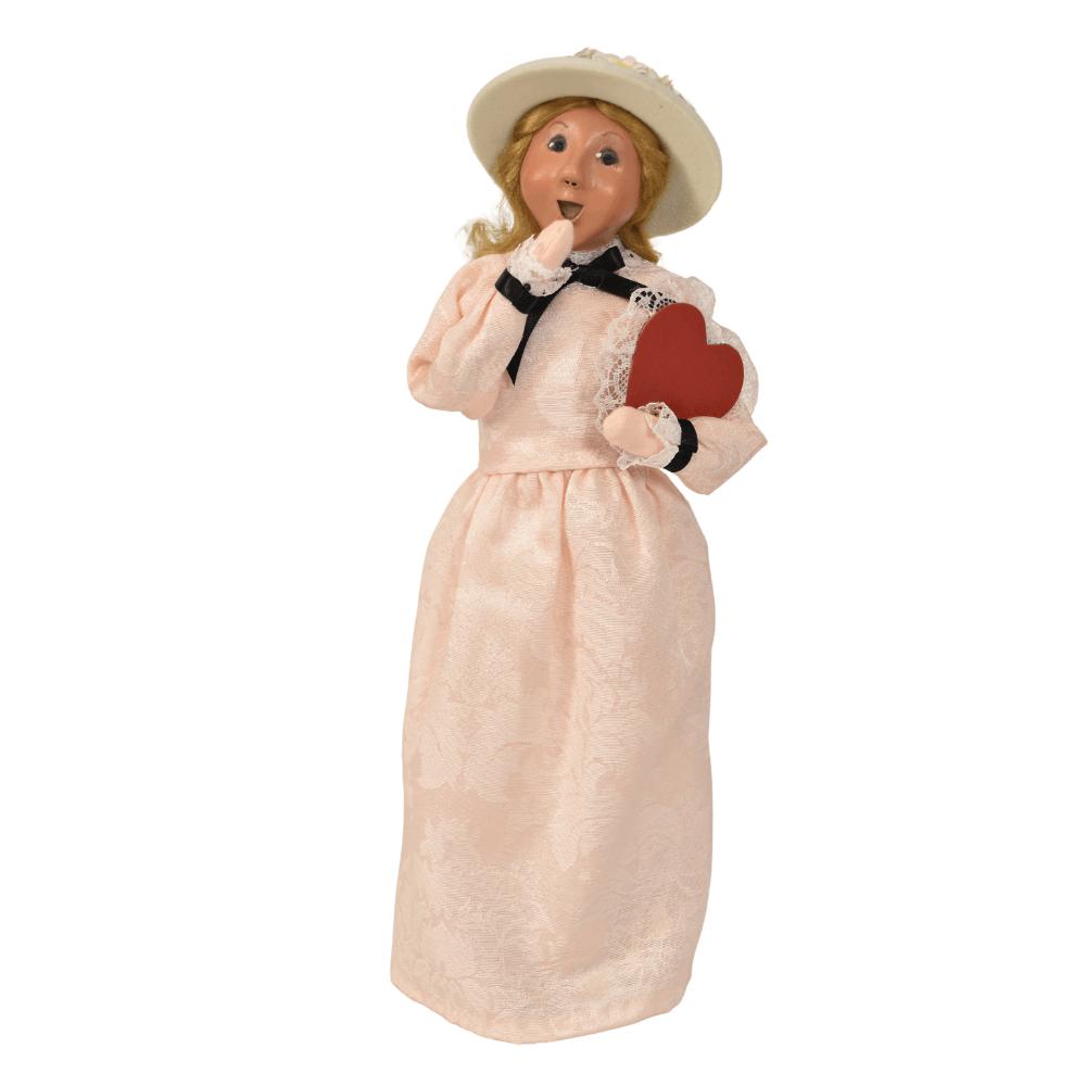 This handcrafted Byers’ Choice Valentine Proposal Woman Caroler is festive and perfect for Valentine’s Day decorating or gifting. Dressed in a soft pink silk gown, she captures the emotional moment of a surprise proposal, making her a romantic addition to Valentine displays and engagement celebrations.