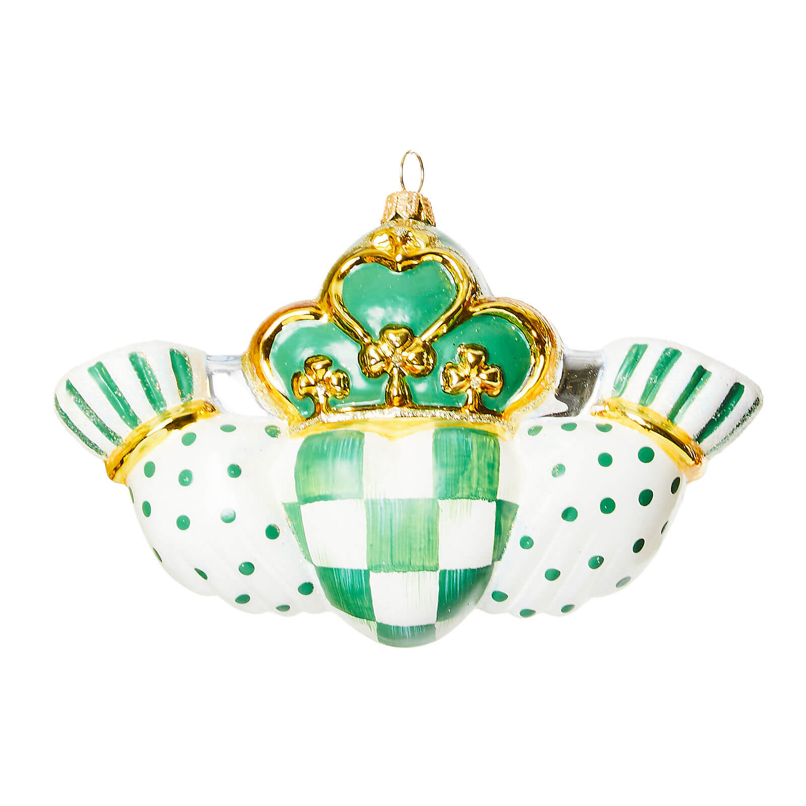 MacKenzie-Childs - Claddagh Glass Ornament Add to the memories year after year with our collection of beautiful glass ornaments that are mouth-blown and hand-painted in Eastern Europe by some of the world’s most talented glass artisans. This claddagh glass ornament, inspired by our ceramic Lucky Check Claddagh, is decorated with green checks. It’s presented in a keepsake gift/storage box. Dimensions: 5.5" wide, 4" tall, 1.5" deep Materials: Mouth-blown hand-painted glass. Pieces may vary due to the handmade nature of each product. Imported. Care and Use - Dust with soft, dry cloth. Store in box to prevent breakage.