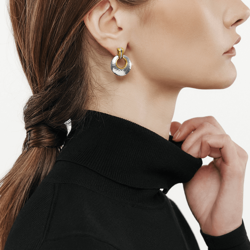 Collection: Ferrara Color: Silver-Gold Type: Post with flat disc back Width: 5/8" Drop: 3/4" Finish: Two Tone Product #: JA9266