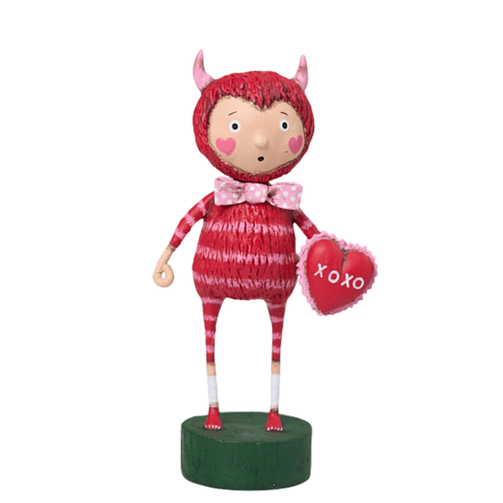 Oh, he’s devilishly cute in his red jammies with their playful pink stripes. Those tiny pink horns are the perfect finishing touch! And in his hand, he’s holding a bright red heart that says everything you need to know… XOXO.
