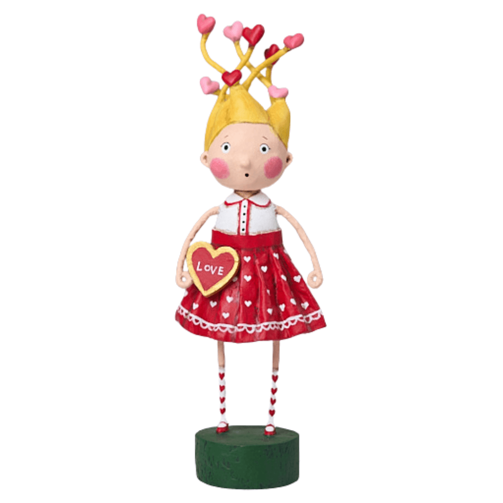 A charming girl with delightfully tangled hair—and an equally tangled heart—is head-over-heels in love. Dressed in a crisp white blouse and a bright red skirt, she’s all sweetness and sparkle. Little hearts dot her blonde locks, and the big heart she holds proudly shares her message of love with the world.