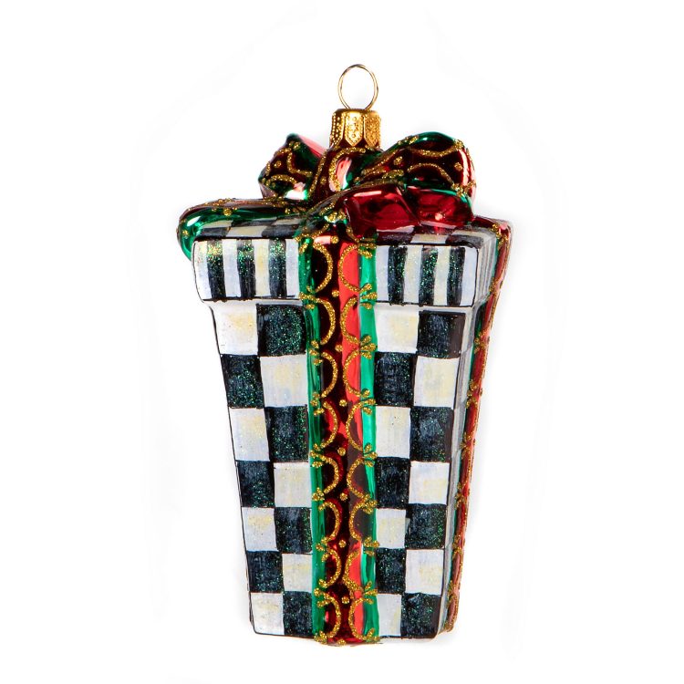Add to the memories year after year with our collection of beautiful glass ornaments. Colorful and charming, the Courtly Classic Gift Glass Ornament is wrapped in Courtly Check and Courtly Stripe and topped with a red and green bow. This ornament is finely handcrafted, mouth-blown, and hand-painted in Eastern Europe by some of the world’s most talented glass artisans. Includes a MacKenzie-Childs brass logo charm and keepsake gift/storage box.