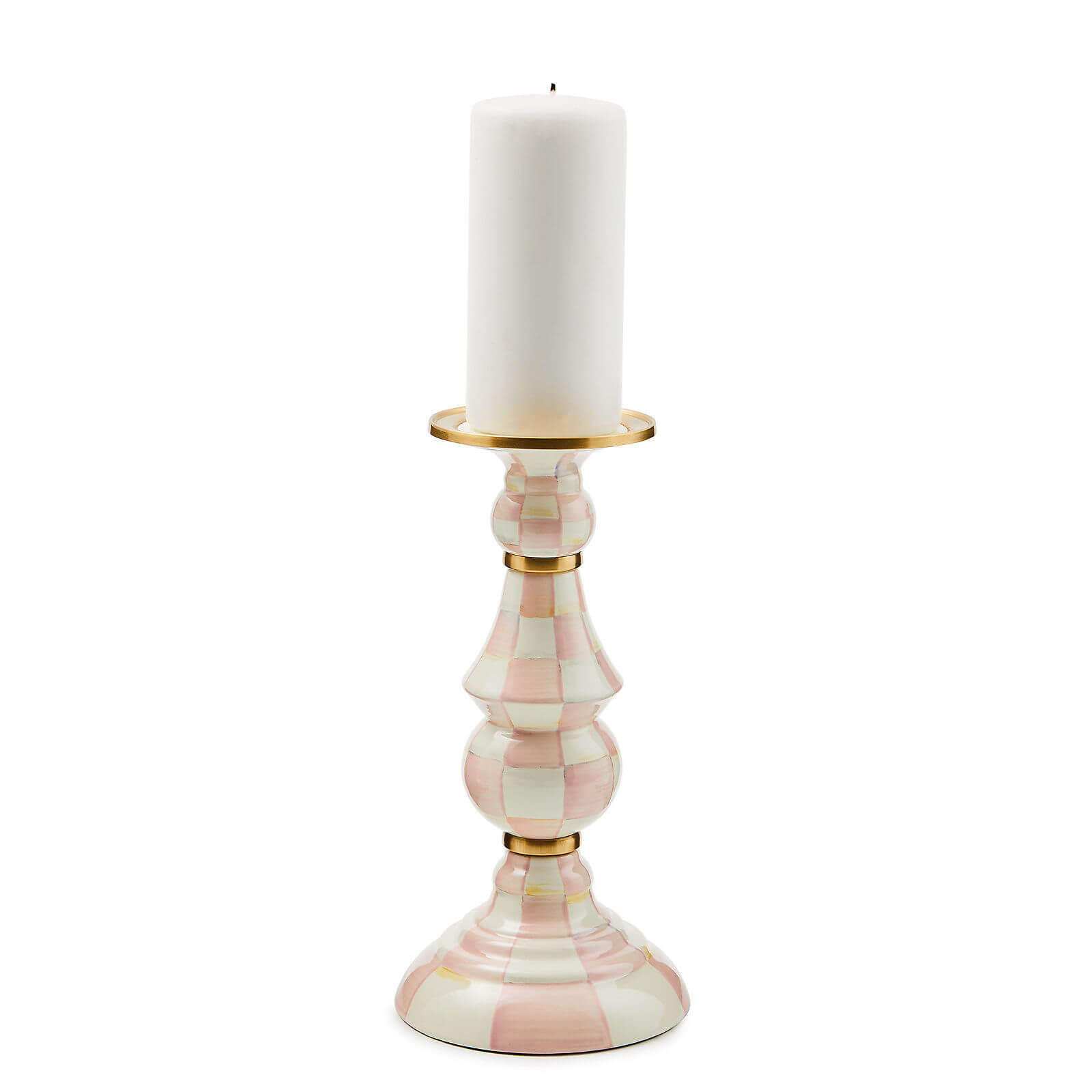 Make an enlightening statement of style by displaying your pillar candles on the Rosy Check® Large Pillar Candlestick. Made of a heavy-gauge, hand-glazed steel underbody with hand-painted Rosy Check, it’s embellished with brass accents and rimmed in bronzed stainless steel.